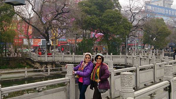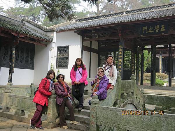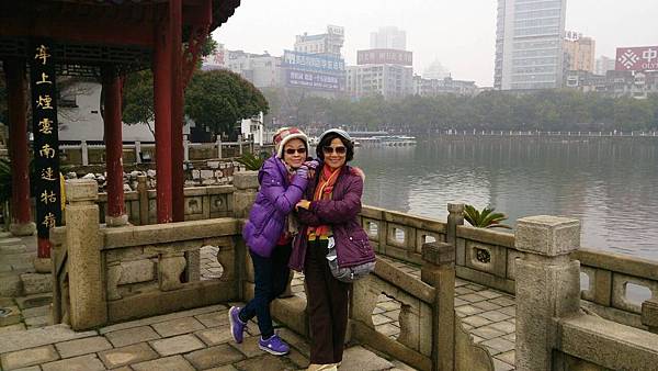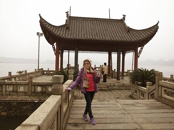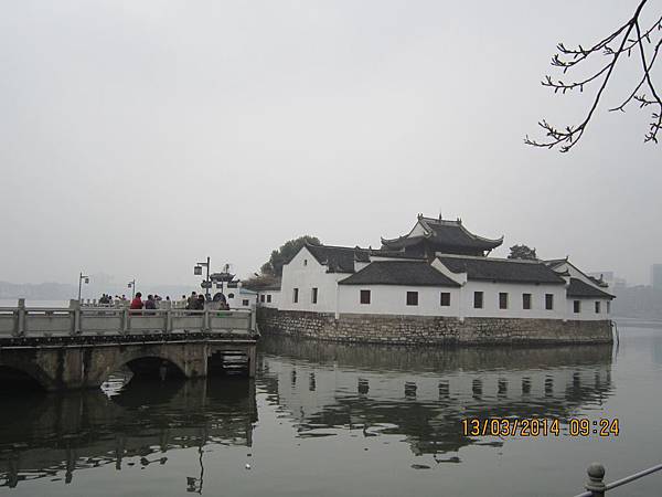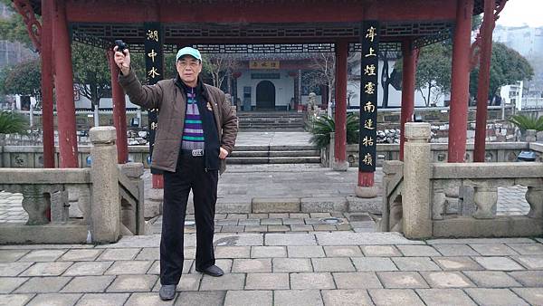 9:10分離開潯陽樓前往鄰近的甘棠湖、要參觀的景點是位在湖中有九曲橋連接到陸地的煙水亭與周瑜點將台。這個景點的面積約1400平方公尺、像個躺在甘棠湖中的小島。走過蜿蜒九曲橋、即到四周環水的煙水亭、相傳為公元二O八年“周瑜點將台”之故址。周瑜在甘棠湖上操練水軍、在湖上築台點將、後來經過無數次的修繕與增建成為現在的規模。進入園區內、亭台樓閣、景色優美。從烟水亭眺望甘棠湖、湖面波光粼粼、碧波蕩漾、别有一番景色。我們參觀至10點便離開前往下一個景點~白鹿洞書院、離九江市半小時車程