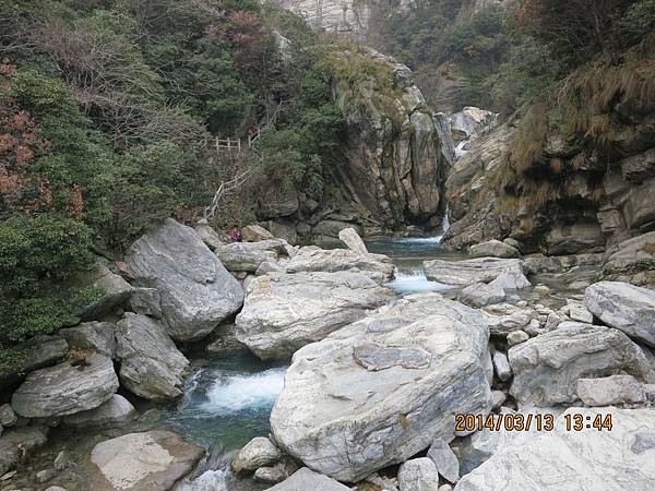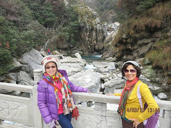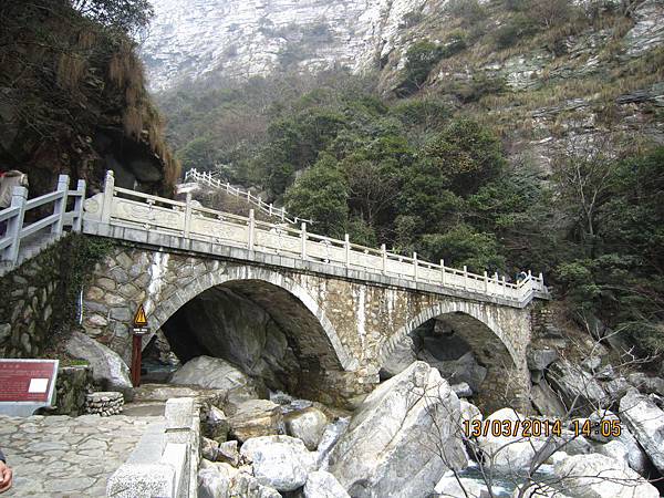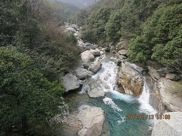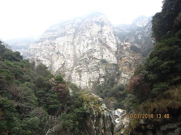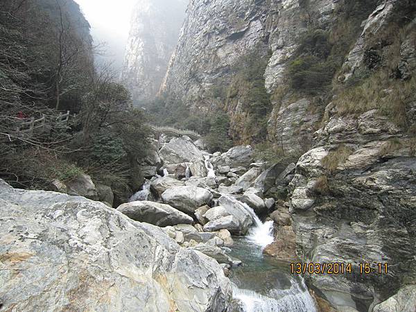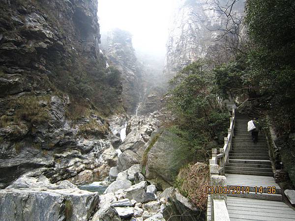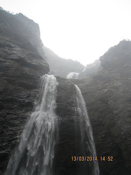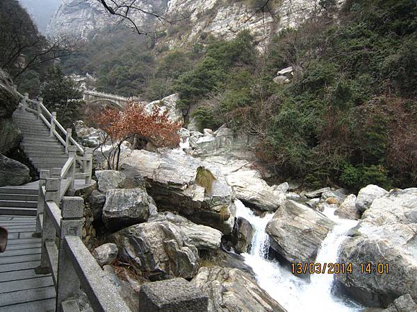 2000多個階梯爬起來是辛苦的、幸好沿路有很多美景可停下來欣賞順便歇息、尤其是位於屏風叠山下、海拔410公尺的〝玉川門〞。此處兩崖峙立、石頭白如玉、清澈澗溪奔流而過、美不勝收。其他景點有飛來石、鐵壁峰、鷹嘴峰、雙溪橋和天門潭都非常引人入勝。過了天門潭、三疊泉已經在望了、大夥兒加緊腳步抵達觀景台時都被眼前的壯觀景色給征住了!它確實美得不同凡響。