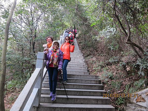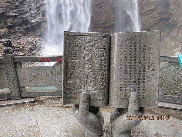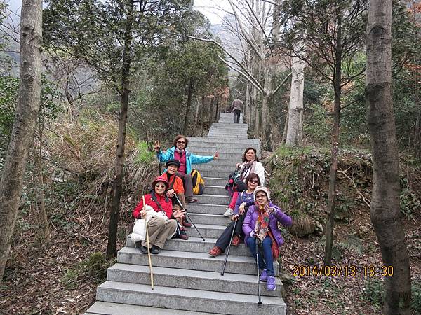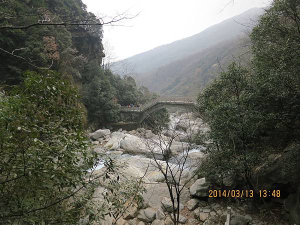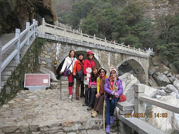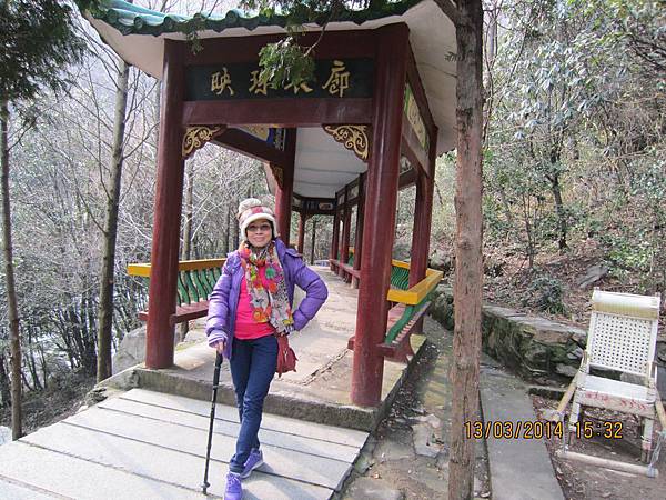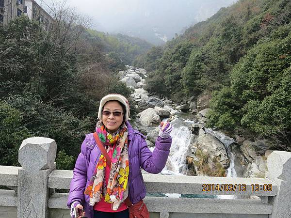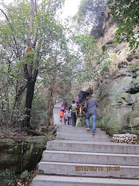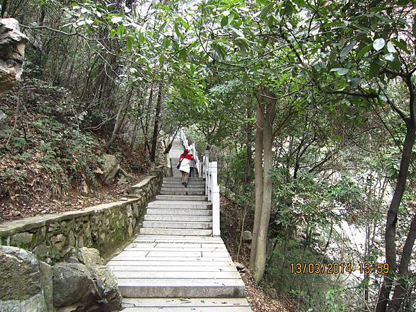 來盧山唯一不可錯過的美麗景點~三疊泉、但要爬2000多個階梯、經過5座石橋才能看得到。我們從停車場坐上環保電瓶車抵達登山口、為了一睹盧山三疊泉的盧山真面目、大家拼了!由於顧慮到我末癒的傷、只好又靠滑竿上山。別以為坐滑竿很舒服、且別說它的椅子不好坐、光一路聽轎夫啐啐唸討小費就會被煩死!我不敢唸他、因為怕他們不爽故意摔我、一路忍得辛苦、盧山的轎夫貪得討厭。三清山的轎夫水準就高多了、不但沿路向我解說景點及協助我上下轎、也沒提小費的事、臨了論功行賞、前者給拾元都嫌多、後者賞百元都高興。