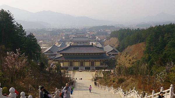 東林大佛景區佔地遼闊、建築群沿軸線佈置。從山門進入後、又長又陡的石階梯最少也有六百階、有許多虔誠的信徒在石階上三步一跪上山禮佛。如不想走階梯、在景區中軸線右側設有上山車道、蜿蜒而上至大佛佛座左側。這一段車路、既可以爲佛座區提供服務、也可以爲年老體弱者提供便利、省去爬一大段階梯的辛苦。我們從車道走上山、沿路古木蔥蘢、梵音繚繞。目前上達佛座的階梯尚未開放、信徒及遊客只能走到拜佛台區。佛座是東林大佛的所在、是宏偉佛尊屹立之處、位於景區中軸線的最高點。