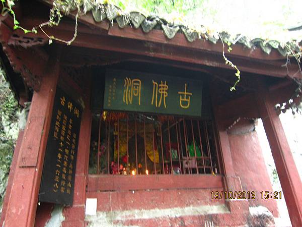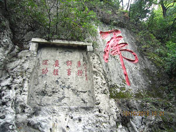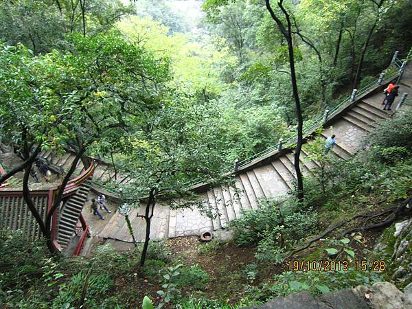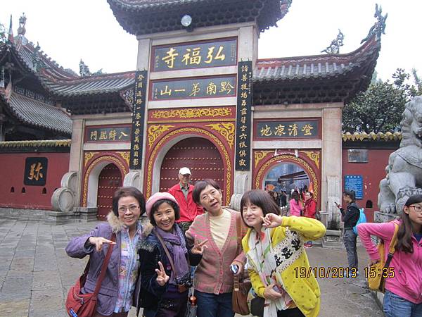 黔靈山頂之弘福寺建於明末清初、全省最大的佛教園林、是貴州有名的佛寺之一。通住弘福寺的登山石道叫〝九曲徑〞、沿著〝九曲徑〞登山、陡峭的石階梯、濕滑難行、部份團友選擇在山腳下參觀麒麟洞、傳說在抗日戰爭期間、張學良和楊虎城曾被軟禁於此洞內。我們則沿九曲徑舉步維艱地登山、陡峭山壁上的文墨石刻均為稀少的文物、並以列入文化保護單位、遊客只可眼觀、不可隨意碰觸。
