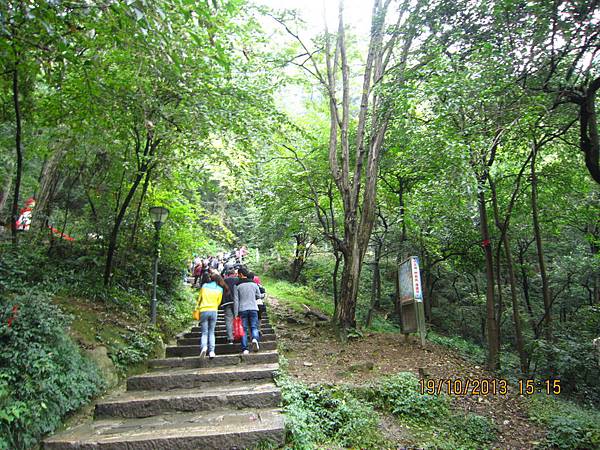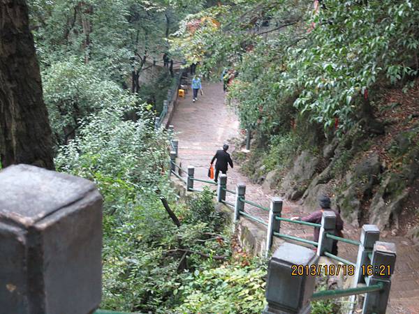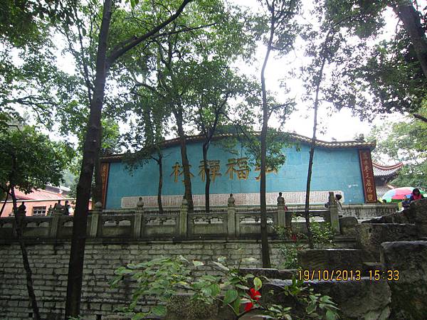 「九曲徑」建於清康熙27年、因為是繞著山而建、共有九個彎因而得名。石徑上的石板階梯因年代久遠、早已被磨得平滑光亮、碰到雨天時、走起來得格外小心。曲徑又是依山勢峭壁築石而建、石徑通幽、綠蔭夾道、雨後的山上雲霧繚繞、景色份外迷人。「九曲徑」共有石階383階、每十來步一個摺、數十步一曲、爬得實在累啊!、又擔心時間不夠、沿途的古佛洞、洗缽池和靈官亭等古蹟也沒能看仔細、現在回想起來還真可惜呢!經九道險峻的〝之〞字拐後、好不容易才看到「弘福禪林」四個大字出現在眼前;弘福寺終於到啦!