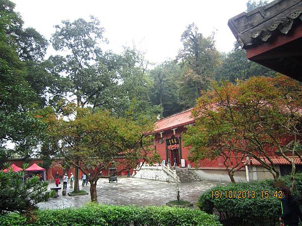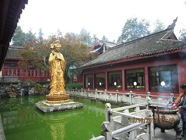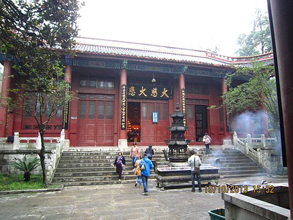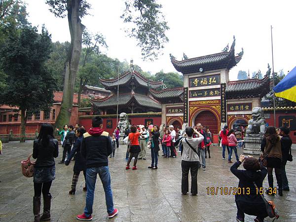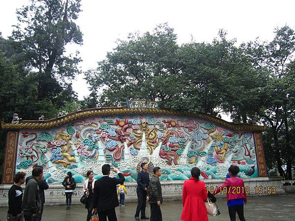 「弘福寺」 是中國重點開放的寺觀之一、寺內殿宇巍峨、香火鼎盛、佛像莊嚴、石塔林立、古樸莊重、有正殿10間、左右也各有10間廂房、法堂、經樓、各個神殿、大雄寶殿、天王殿等等。我們如劉姥姥進大觀園一般穿梭在寺內仔細參觀、一幅巨大的〝九龍浴佛壁〞豎立在正門旁、寺內曲廊青池、繁花似錦、古樹參天、雄偉的弘福寺就掩映於綠樹濃蔭中、別有一番肅穆莊嚴的氣息。導遊說山上猴子多、可是我卻一隻也沒見着呢!
