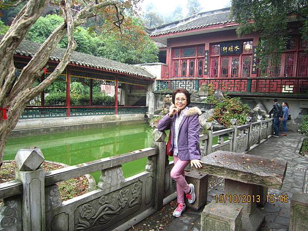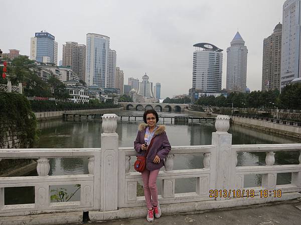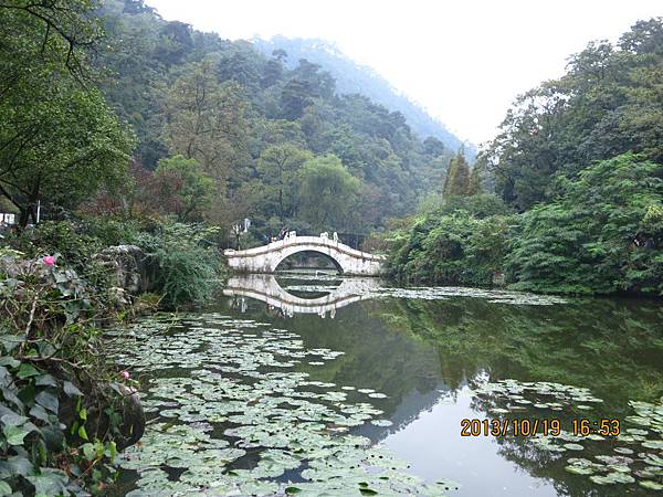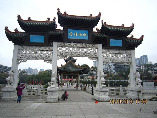 貴陽市區離機場只30分鐘車程、車子進入市區後隨即展開首日的參觀行程。導遊是林英娟、在她的導覽下、我們來到了位於市區西北角、屬4A級旅遊區的「黔靈公園」。它依「黔靈山」而建、佔地400多公頃、以明山、秀水、幽林、古寺、聖泉、靈猴而聞名。園內古木參天、峰巒疊翠、古洞清澗、景致清幽迷人、尢其是黔靈湖畔、一彎拱橋襯托著湖中幾許殘荷、更添思古幽情。