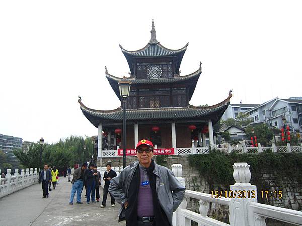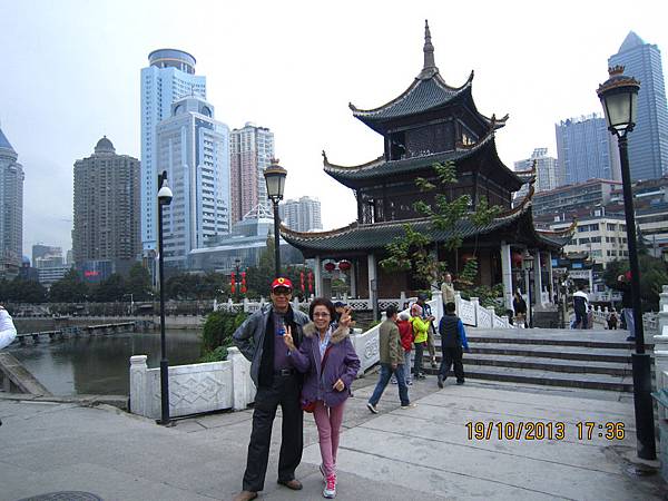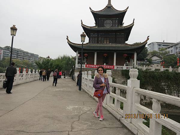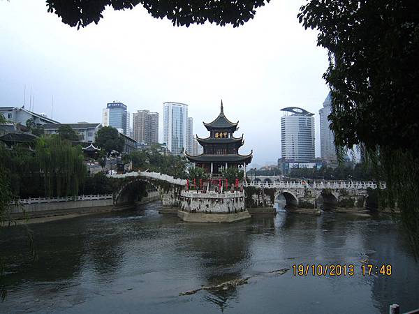 下一站是清代貴陽八景之一的「甲秀樓」。甲秀樓建於1598年、是貴陽市的一個象徵、它位於市區的南邊。到「甲秀樓」前要先經過樓前的一座長90公尺的九孔「浮玉橋」、橋頭建有「城南勝蹟」牌樓、「涵碧亭」建於橋中段、橋下「南明河」似玉帶流水般清幽幽地流過。