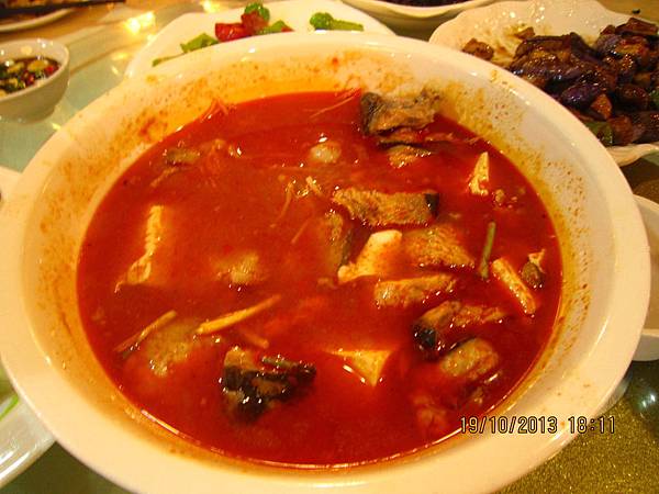 離開翠微樓時已是夕陽西下的時候、遊玩了半天、大夥兒早已饑腸轆轆、「上雅酒樓」的晚餐讓我們第一次品嚐到貴州最著名的〝酸湯魚〞。貴州是一個多民族地區、擅長制酸吃辣、來貴州不能不吃酸湯魚、其與眾不同的酸香辣鮮、的確令人回味無窮。酸湯魚的酸是每家的獨門配方、據導遊說是用野生小番茄經過發酵而成。鮮紅色的湯一上桌、大家都嚇到以為會很辣、但喝了一口後、它在瞬間打開您的味蕾、接下來就停不下來了!一碗接一碗!酸得好!辣得妙!魚肉鮮得不得了!真是一道美味無比的特色酸湯魚啊!