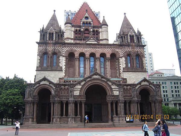 三一教堂和旁邊以玻璃帷幕打造的約翰.漢考克大樓形成現代與傳統建築的強烈對比、這棟高240公尺、60層樓的建築好像一面大鏡子、將教堂和附近街道的身影投影在自己的帷幕上、形成一幅特殊風景、相當有趣。大樓建於1976年、、曾經獲得無數建築獎項、很值得一看。