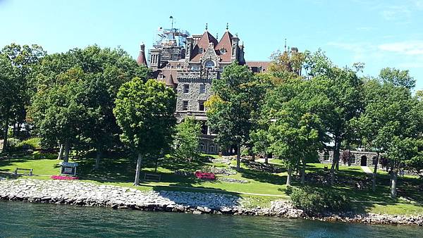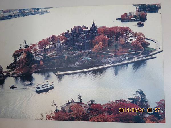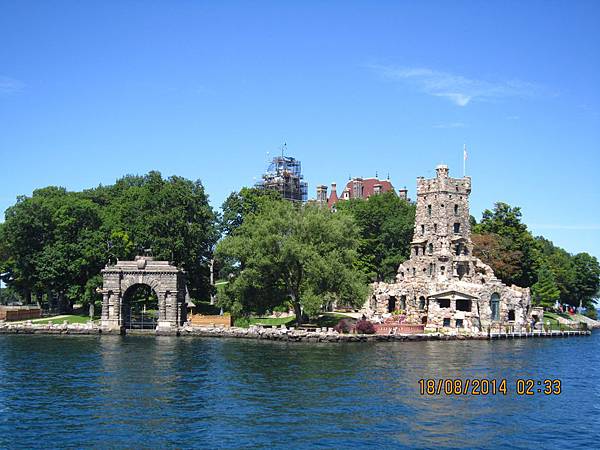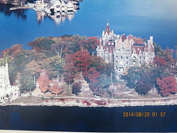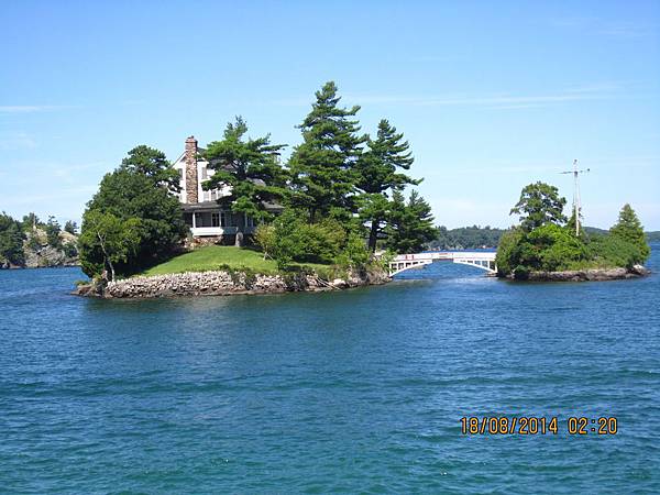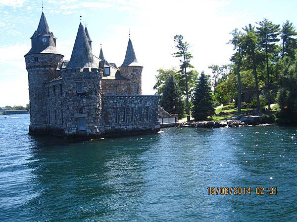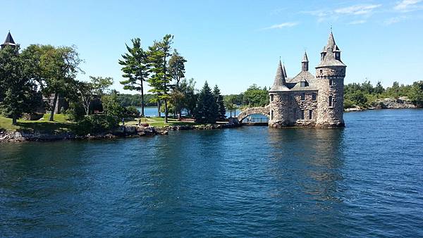 千座島嶼中、其中最有名的是愛心島(Heart Island)、是1900年、一名旅業富豪 George Boldt買下送給愛妻露易斯的生日禮物。他將島修築成心形、並興建了一座歐洲風格的古堡、在愛心島的另一端、另建一座小城堡孝敬岳母、二者之間有小橋相連。但不幸的是、於1904年城堡剛建好、還在裝修中、露易斯便因心臟病突然病逝。Boldt悲痛不已、遂令無限期停工、也不再踏足此島。人們感動於Boldt對愛妻的真摯感情、將此島命名為愛心島。Boldt死後、依造他的遺囑、此島贈給了美國政府。看到這座小島、心中有一股濃濃的浪漫與淒迷感。