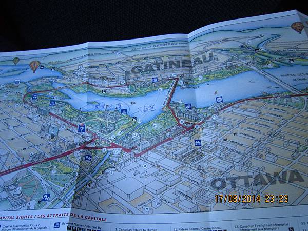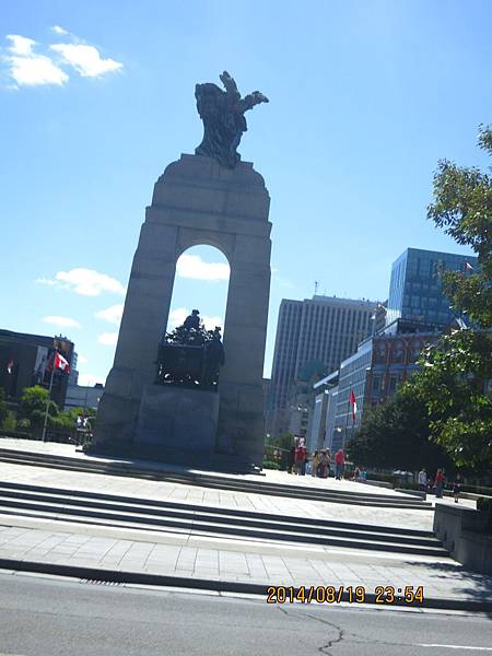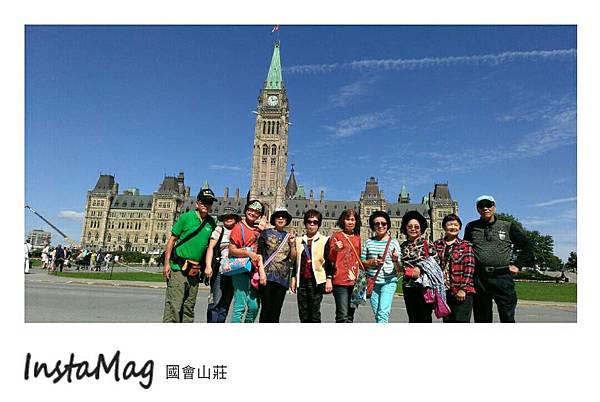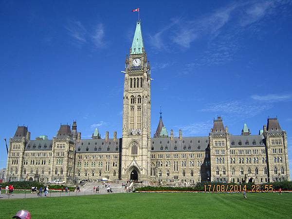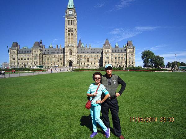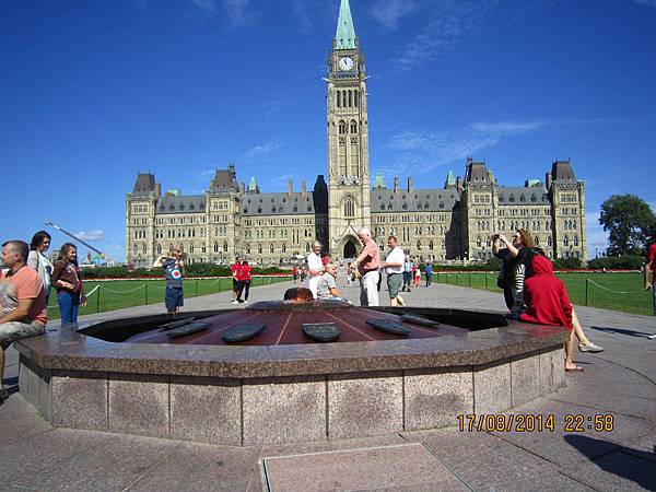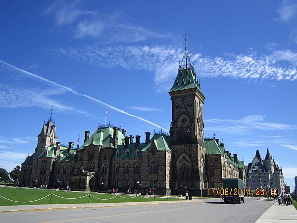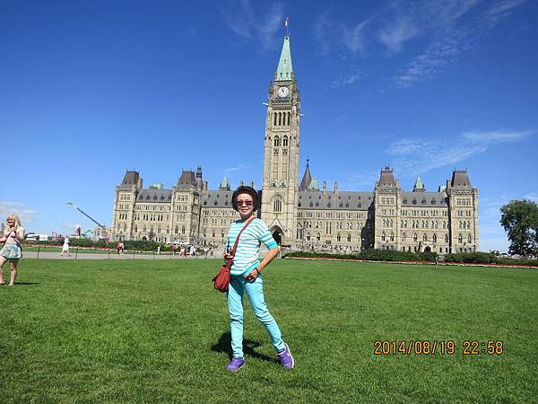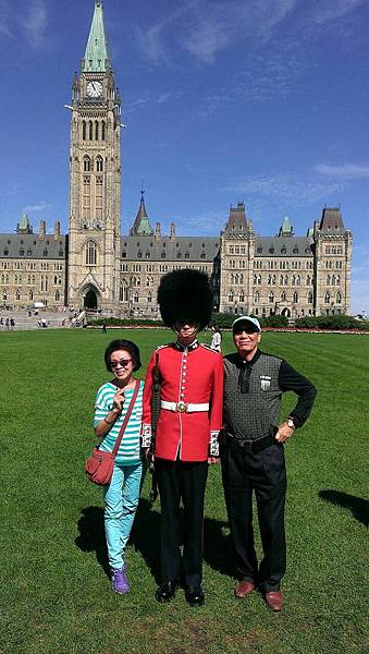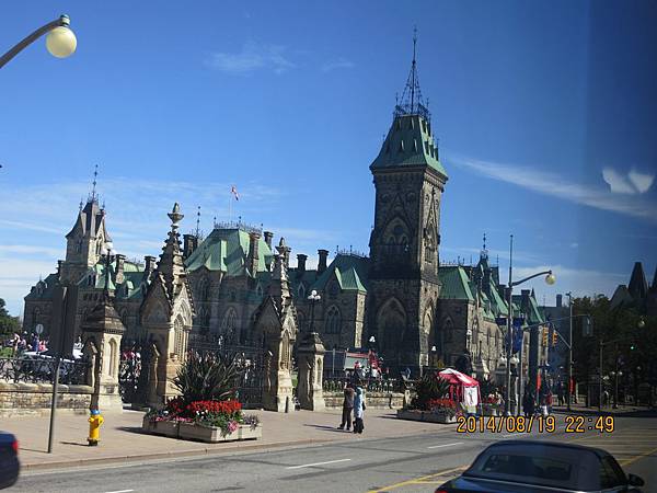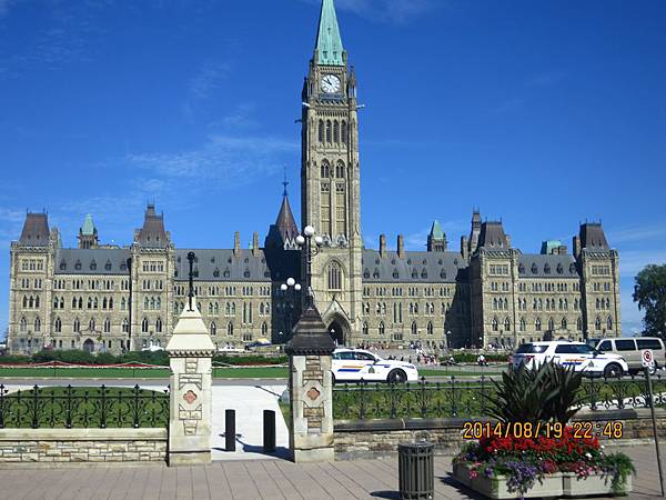 我們於早上10:30分左右抵達渥太華上城區、這裡亦是國會山莊、圍繞著國會山莊的全是政府機關和國會大厦。坐落在渥太華河畔國會山麓的國會大廈是渥太華著名的建築群、中央有陳設著加拿大各省標誌的大廳和一個高89.5公尺的和平塔、塔頂有個帶著53個鈴鐺的鐘琴和一個巨大的鐘、每個整點、鐘塔都會敲鐘、悅耳的鐘聲響遍了整個渥太華市。和平塔內有戰爭紀念碑、塔的左、右分別是眾議院和參議院、下議院在左側、上議院在右側(目前在維修中) 、後面是規模宏大的國會圖書館。