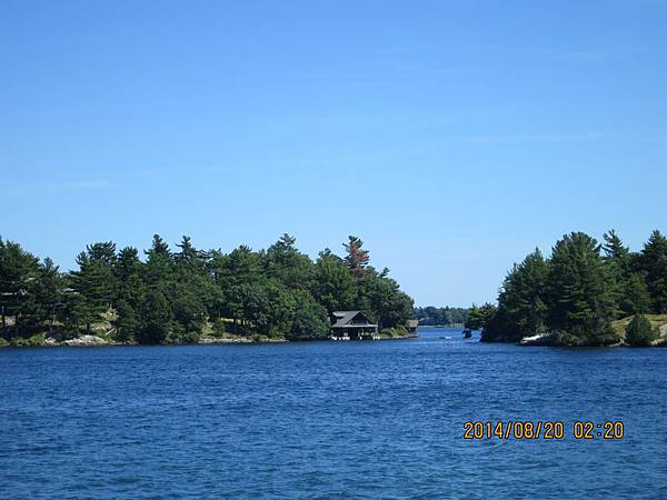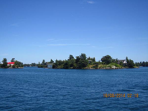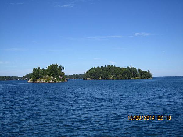 千島湖擁有1865個大大小小的美麗島嶼、湖的一半以上在加國境內、另外南岸的1/3屬美國紐約州。一座大橋橫跨美加兩國邊境、橋的中央是兩國的分界、由於船上人多、拍照不易、距離又太遠、我只好眼巴巴地看著它漸行漸遠。