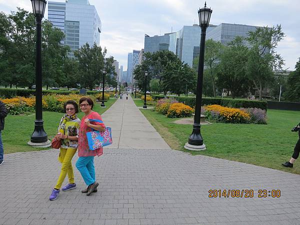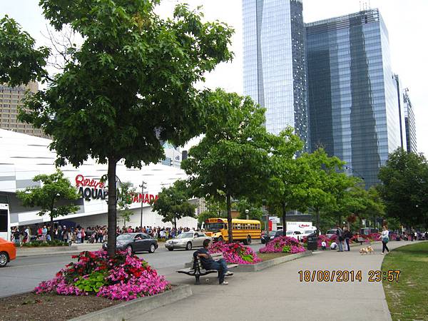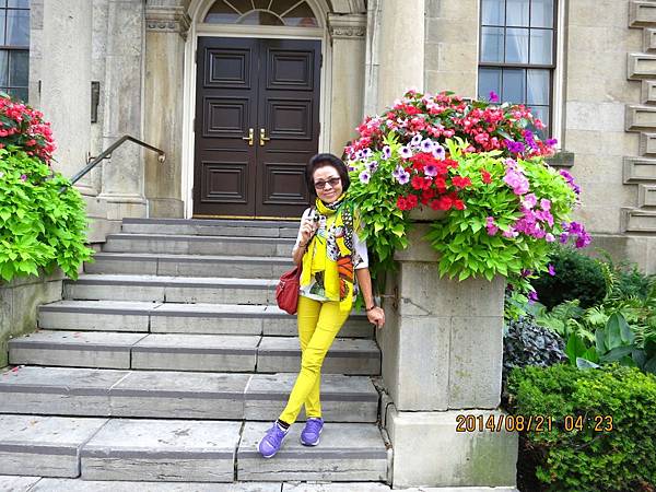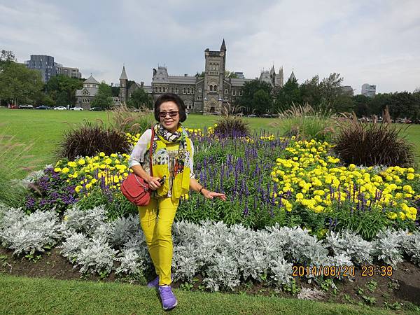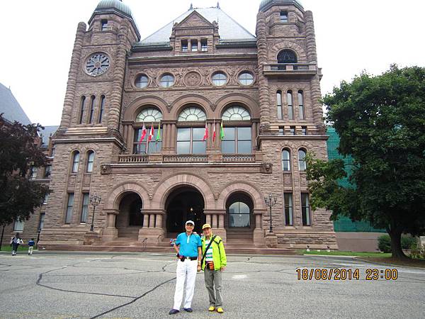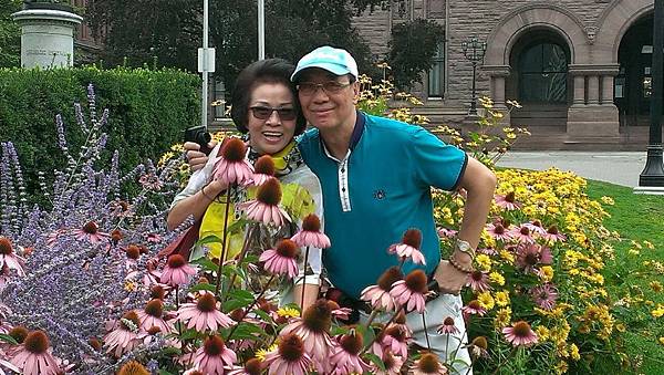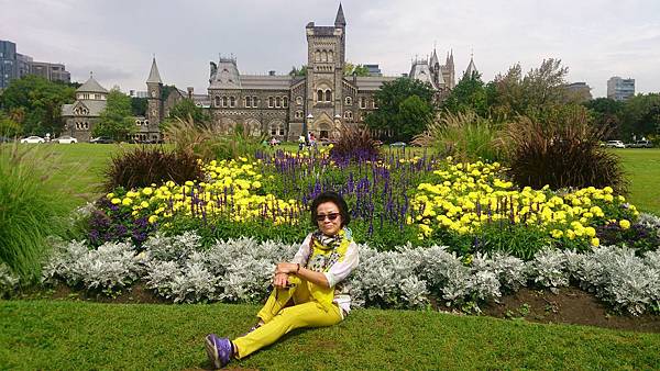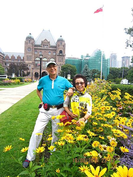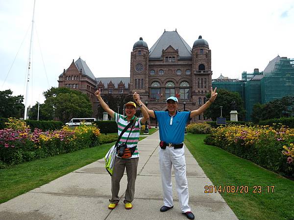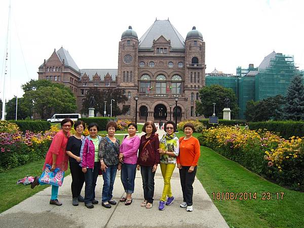 接著10:45分來到相距不遠的安大略省議會和維多利亞女皇公園。一百多年歷史的省議會是棟呈現羅馬風格、歷史悠久的議會建築。由於外觀是以紅砂岩磚砌蓋成、所以看起來就像一棟漂亮的粉紅色房子、相當吸睛。圍繞著省議會周圍的女皇公園也是多倫多美麗的景點之一、綠樹和草坪整理得有條不紊、各種色彩繽紛的花朵點綴在公園內、一群愛花的女人像蜜蜂一樣在花欉中亂竄。