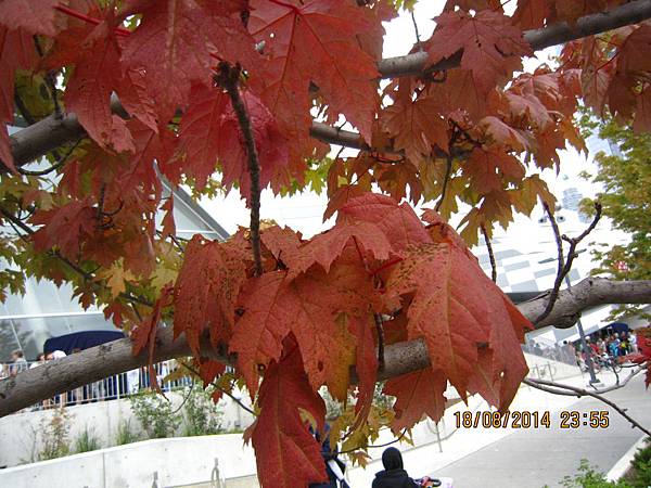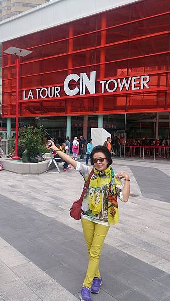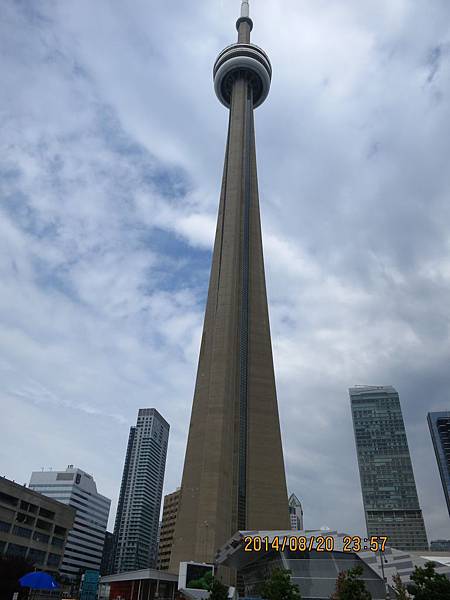 西恩塔是我們接著要去參觀的城市地標、它也是多倫多的象徵。這是一座電視及廣播之用的電波通信塔、號稱為Skypod(天空之蓋)、塔上有瞭望台可將城市景觀一覽無遺。西恩塔高553公尺、遊客可購票上去參觀、但要花最少90分鐘、因為排隊購票就要排上一小時、再經嚴密的安全檢查後方可進入塔內。我們沒那麽多時間、只能在塔前的紀念品店內掃貨、買了一組楓葉圖樣的杯子。