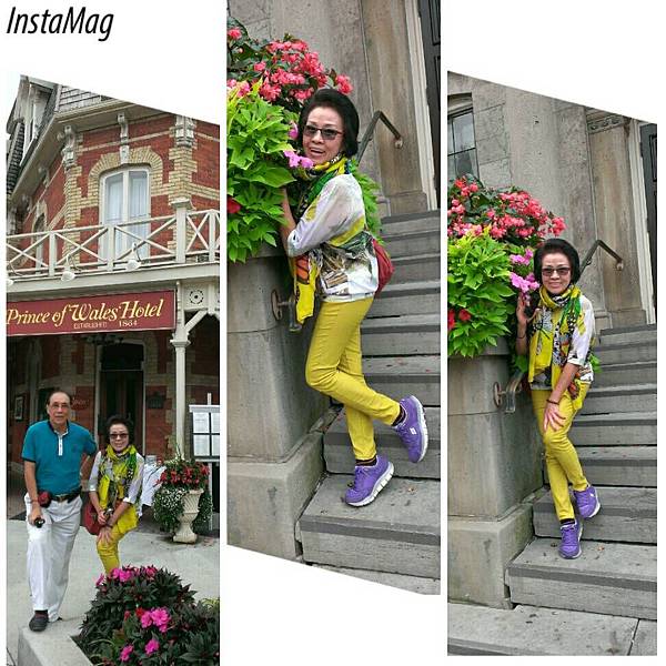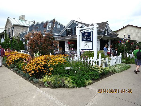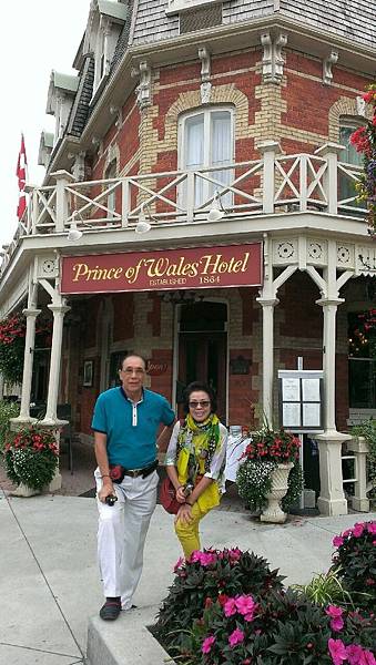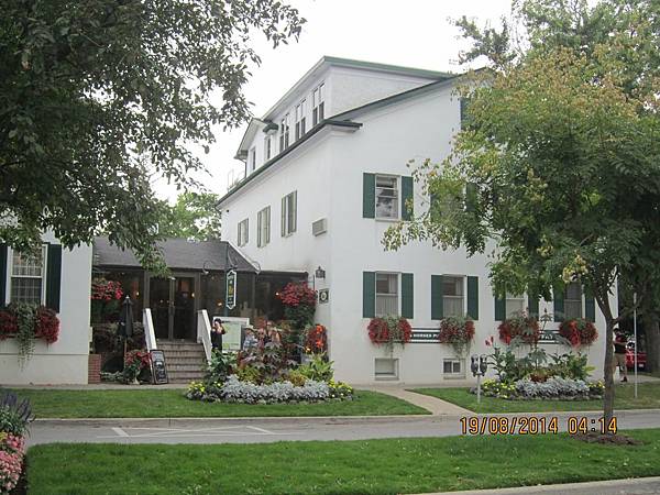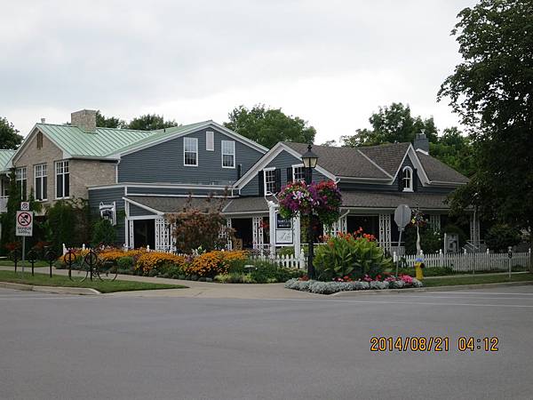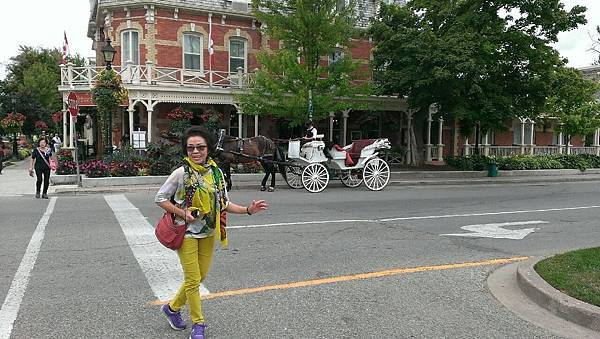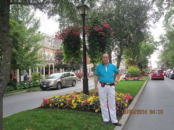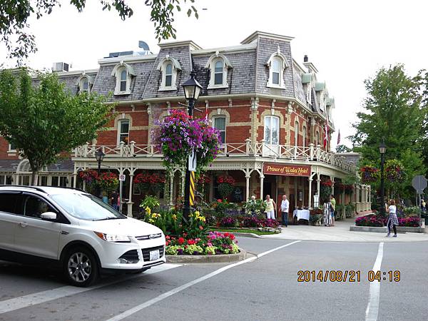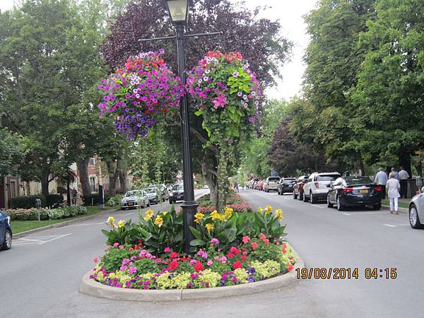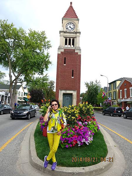 在18世紀時、湖邊小鎮曾經是安大略省的首府、可見這小鎮的存在已有兩百多年歷史了、某些街道上還殘留著早期拓荒時代的濃厚氣氛。漫步小鎮上、極目所及盡是些小巧可愛的房子。皇后大道是小鎮上的主要大道、整條街道上粧點著五顏六色花卉、連燈柱上也垂掛著美麗鮮豔奪目的花籃、酒店和街道旁的商家都佈置得很溫馨、因此吸引了不少人駐足。沿著街道行走、每個轉角都有驚喜、美麗得簡直就像是電影裡的佈景一般。街道中央、被鮮花環繞著的鐘樓是湖邊小鎮的地標、再往前走就是安大略湖了、附近有很多釀造冰酒的酒莊和一些民居。我們只步行到鐘樓便折返、這一段大約300公尺最漂亮熱鬧的皇后大道的確令人驚艷、這也是居民用心努力維護下的成果。