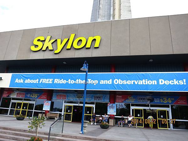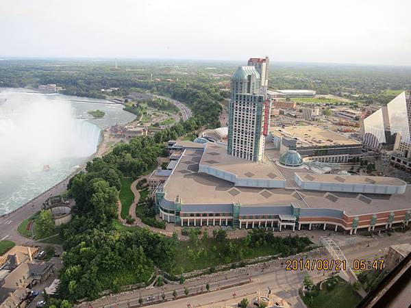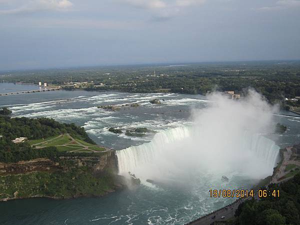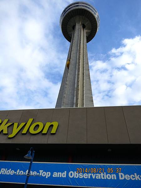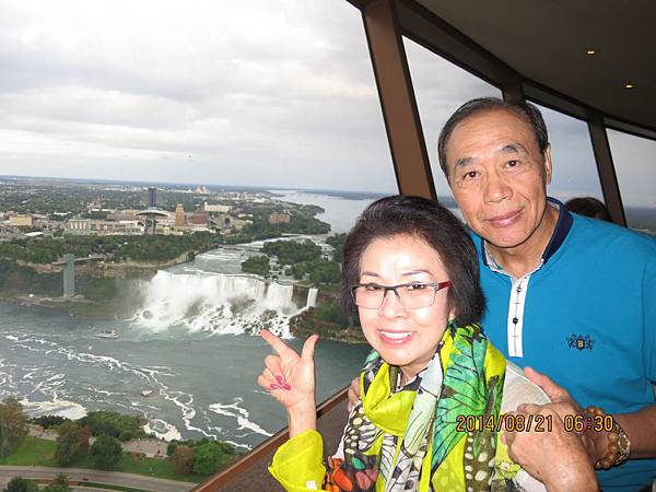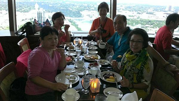 今天的晚餐是大夥兒最期待的、我們要在160公尺高的史凱隆塔(Skylon Tower) 上用餐。來到尼加拉瀑布,想要登高眺望壯闊美景、就一定要上來看看。乘坐外露式景觀電梯上樓頂、在電梯升降的同時欣賞風景、只需52秒就能來到我們用Buffet的餐廳、一邊用餐、一邊居高臨下欣賞窗外美景。360度的透明玻璃窗、不管從任何角度看、都可以將脚下的尼加拉瀑布盡收眼底、非常壯觀的氣勢令人嘆為觀止!