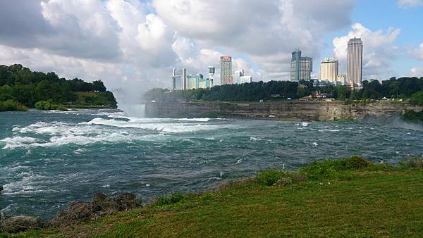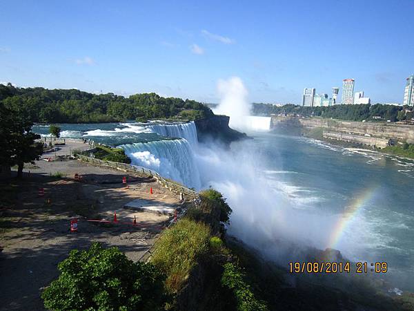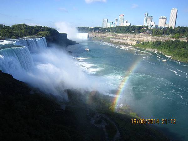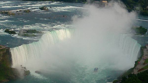 尼加拉河帶著美國四大湖的水、匯流至安大略湖、匯集後的水量成為一股奔騰不息的巨流、流到了懸崖、一瀉千里、高度再加上洪流的巨大衝力、沖刷出7公里長的峽谷、澎湃的氣勢、猶似千軍萬馬、在峽谷中迴盪不已、更令岸邊的遊客無不像著魔一般、看得目瞪口呆,深深被尼加拉瀑布的爆發力震憾住。