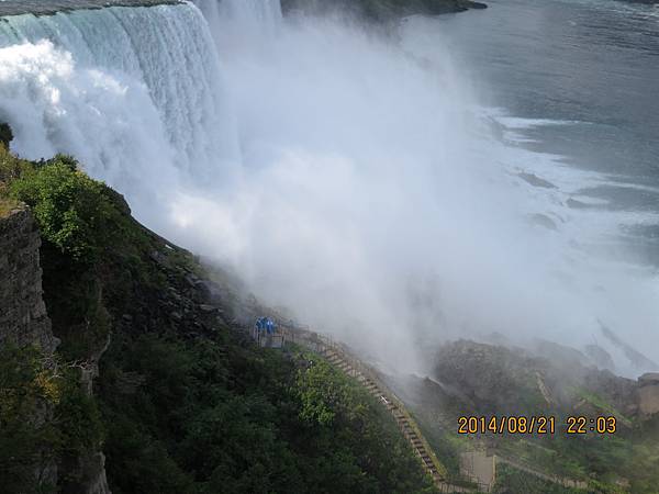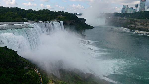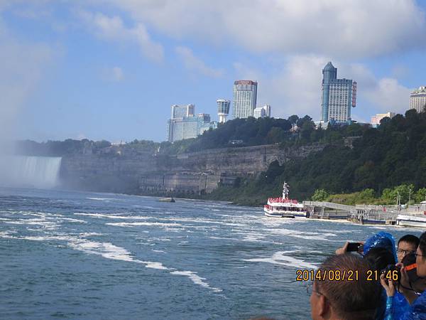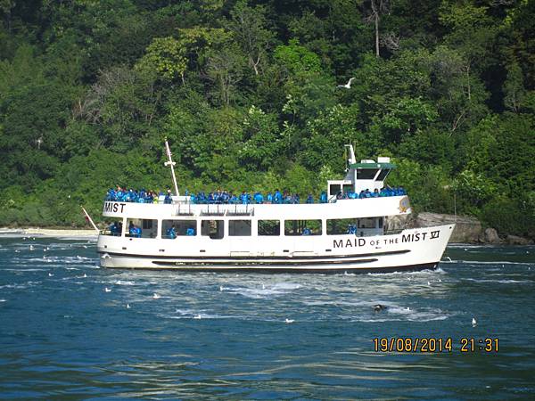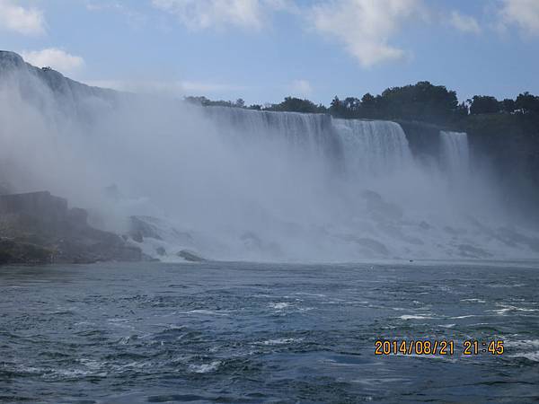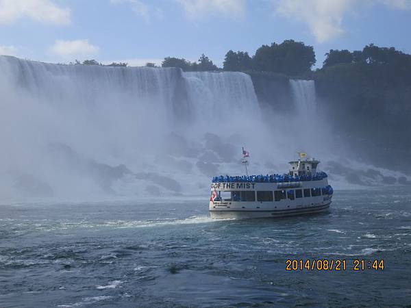「霧中少女號」遊船從1846年啟航至今、已走過168年歷史了。從美國境內出發遊船的遊客一律穿著藍色雨衣、從加拿大境內上船的客人則穿紅色雨衣以示區別。遊船開始了、先是緩緩地駛向新娘婚紗瀑布、水霧越來越大、臉上已漸漸蒙上一層水氣、當船越靠近瀑布、風勢越大、水霧也更強了、大夥兒身上的雨衣被風捲起、連雨帽都被掀了起來。近距離看美國境內宛如新娘婚紗一般的純白色瀑布、雖然比馬蹄瀑布小、但是有著一種新嫁娘的羞答答美感。這瀑布沒有水潭、洶湧的瀑水垂直衝擊瀑布底部的岩石、如雷貫耳的聲響令人印象深刻。
