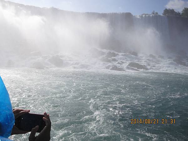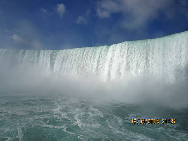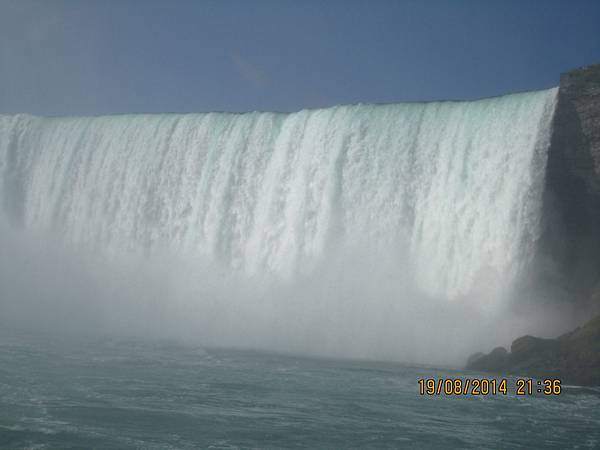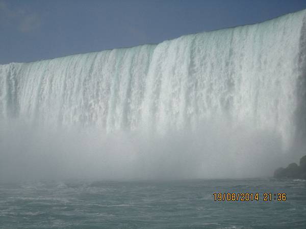 「霧中少女號」漸漸地引擎全開駛向加國境內的馬蹄瀑布、我的心跳也跟著加速、嘩!眼前的瀑布牆如千軍萬馬、奔騰咆哮似地迎面而來、像要把我們吞噬了!如翻江倒海的瀑布確實是太壯觀!太刺激了!水霧完全模糊了視線、眼睛都幾乎張不開。瀑布的氣勢如500萬匹馬力、以每秒約400萬公升的水量傾洩而下、轟然的巨大聲響伴隨著四濺的水花、把周圍營造成一片白茫茫的世界。這時候、眼前除了一大片白色外、其他什麼也看不到!水霧像豆大的雨點急速地打在身上、船像行駛在五里霧中、到幾乎無法抵擋水勢的地方再回頭、此時瀑布造成的震撼力已非言語可形容!我終於得以一償宿願見識到這世界之最、心中有感動、更有感恩、感謝我的另一半還有好朋友們共享這難忘的旅程。