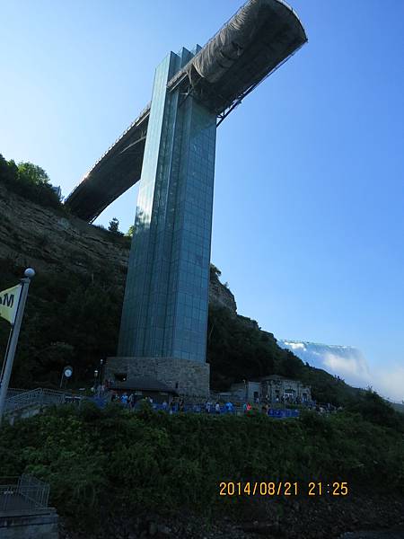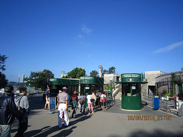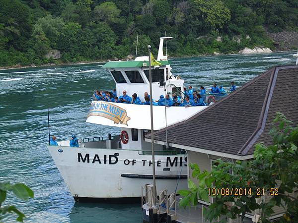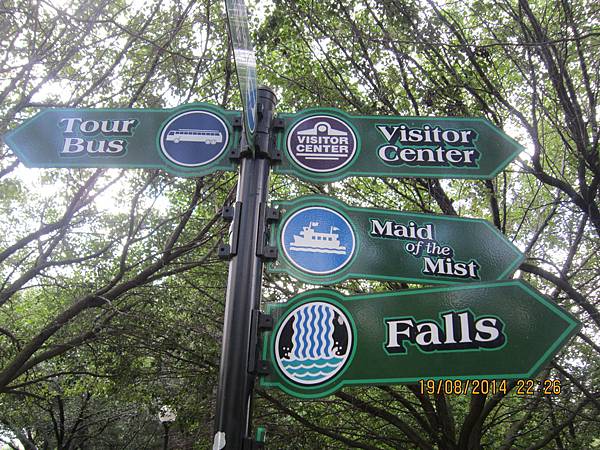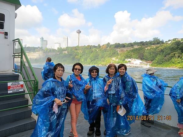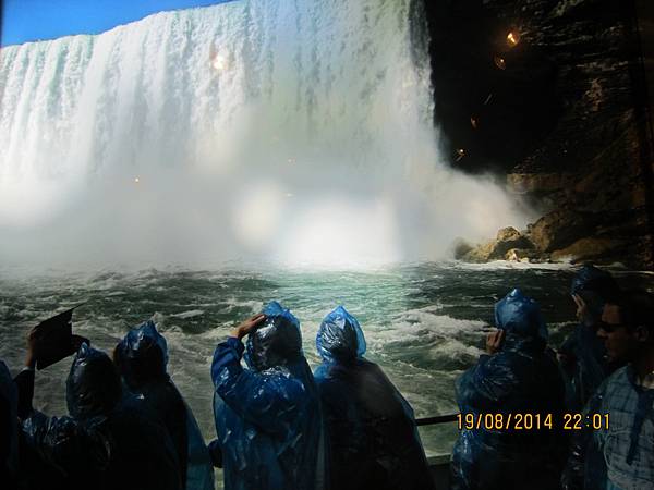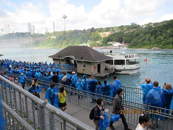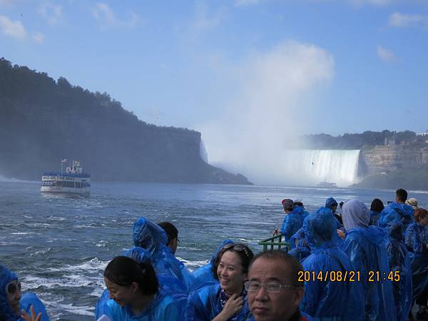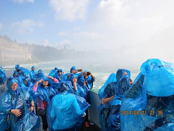 我們從飯店出發、車子沿著尼加拉河走、半小時後抵達景點區遊客中心、穿過遊客中心後經過一小段公園樹林區、領隊購買門票後進入一座空橋向前走至電梯處、在空橋上就可感受到瀑布的爆發力了。搭電梯往下走到46公尺的峽谷隧道、走過石壁隧道再往右手邊走、每人便可領到一件藍色斗逢式雨衣、這時候瀑布的水氣已四處飛散。穿上雨衣步上「霧中少女號」遊船、準備接受尼加拉瀑布的洗禮囉!此時、心中如小鹿亂撞、即期待又怕自已不小心漏看了天下美景的某一部份、不斷提醒自己非要全神貫注不可、不知道別人會不會也像我一樣有著五味雜陳的緊張心情!