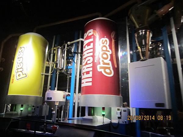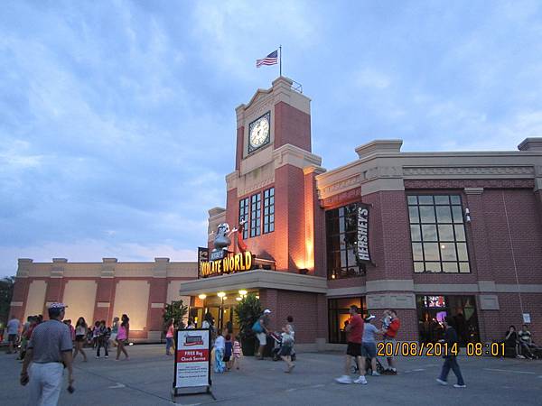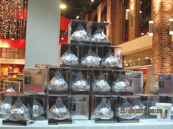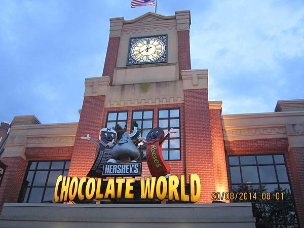 車抵哈里斯堡已是晚上8:00點、隨即參觀著名的賀喜(Hershey's)巧克力工廠。這裡是世界最大的巧克力類糖果製造工廠、被譽為世界上最甜蜜的地方。Hershey's在哈里斯堡擁有3家最現代化的巧克力工廠、遊樂園、商店和飯店。工廠每天24小時不停地運轉、生產的巧克力品牌除了Hershey's、還有Kisses、Reese's、Joy等等。遊客可坐上小火車免費享受一個全方位製作巧克力的過程、也可以在購物中心選購數十種形形色色的巧克力或紀念品如帽子和玩具等。置身在一堆巧克力中、可真正感受到這裡的確是世界上最甜蜜的地方啊!
