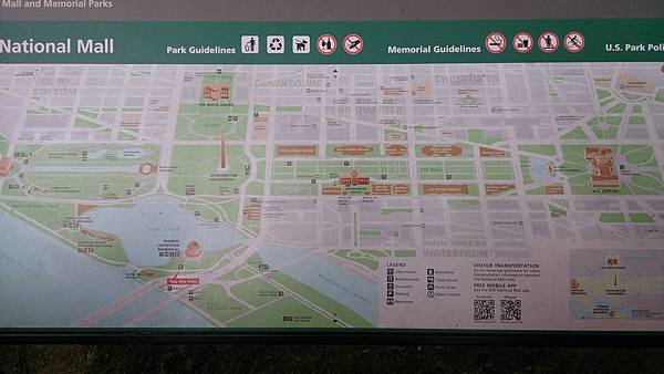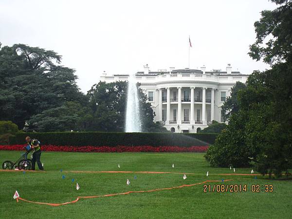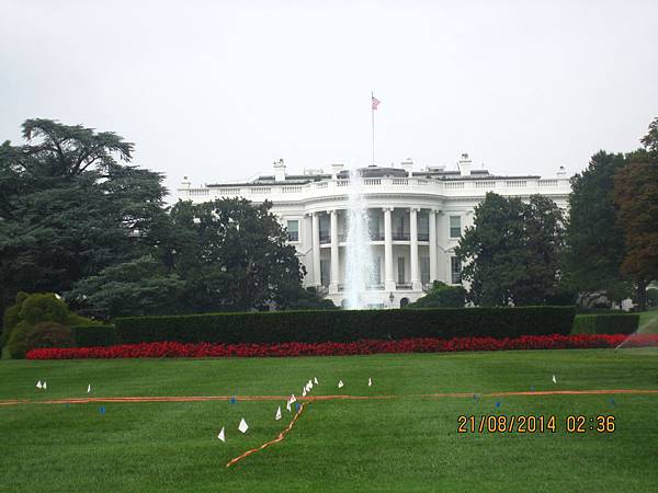 我們隨即參觀了美國歷屆總統的官邸和辦公的地方~白宮、白宮是一座白色大理石圓形新古典風格砂岩建築物。美國國旗在白宮屋頂上飄揚、表示今天總統奥巴馬正在白宮內辦公。隔著圍欄看白宮、眼前正是白宮正樓前的總統花園、綠意盎然的草坪和樹木襯托著純白色的建築、有著素淨的美感。西邊是總統的橢圓形辦公室、白宮二樓是第一家庭的生活空間。其實白宮連地下室共有6層、大部份在地下、或者被樹林遮蔽、通常遊客只能看到2-3層而已。據說白宮建築總面積5100平方公尺、有132間房間、35間衛浴、412扇門、147扇窗、28座壁爐、8座樓梯、3部電梯、5位全職大廚、1座網球場、1條保齡球道、1座電影院、1條慢跑跑道、1座游泳池、1座小型高爾夫練習場。住在裡面、我可以一個月都不用出門。