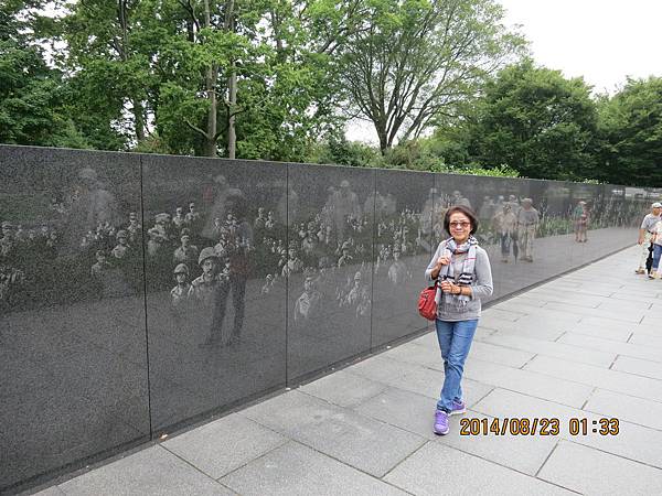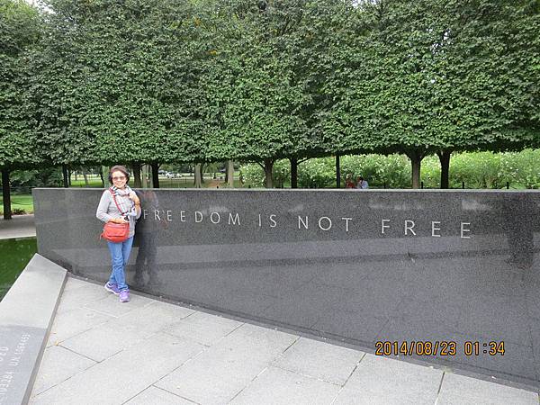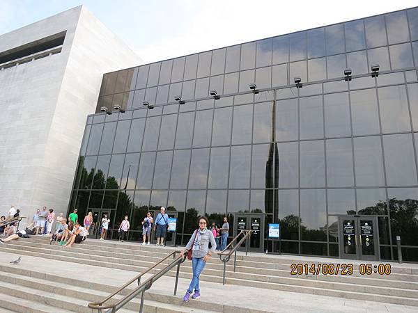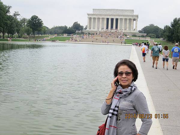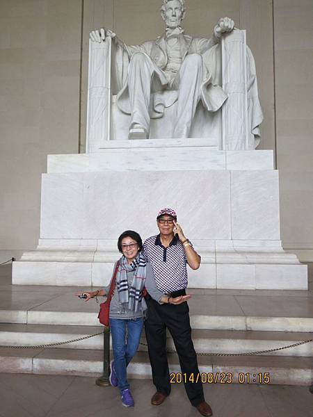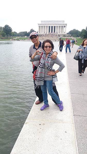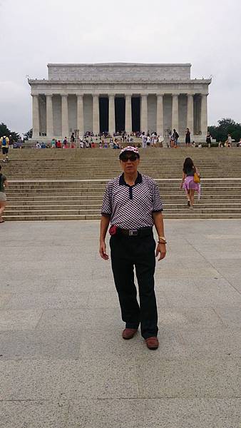 接著來到建於1922年為紀念美國總統林肯而設立的林肯紀念堂。這是一座由建築師亨利·培根設計師所設計建造、並獲得了全美建築協會頒發的設計金獎的著名建築物。林肯紀念堂(Lincoln Memorial)位於華盛頓特區國家廣場西側、波多馬克河畔、與國會和華盛頓紀念碑成一直線。來到林肯紀念堂、我被那純白色古希臘神殿式建築深深吸引、那是多麽雄偉又莊嚴的美麗建築啊!整座建築呈長方形、36根白色的大理石圓形廊柱環繞著紀念堂、象徵在林肯總統任內時所擁有的36個州。每個廊柱的橫簷上分別刻有這些州的州名。