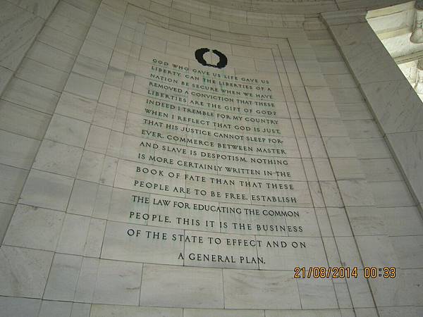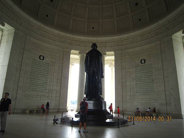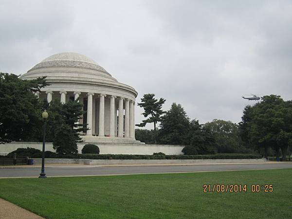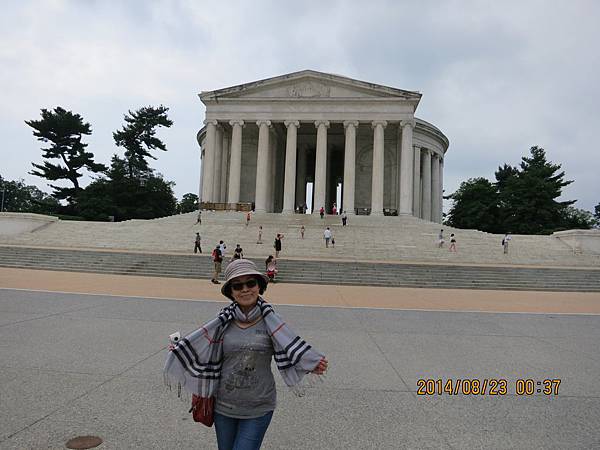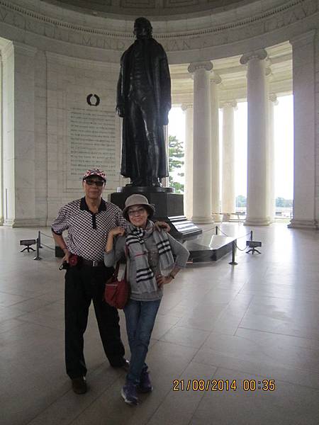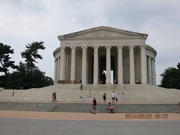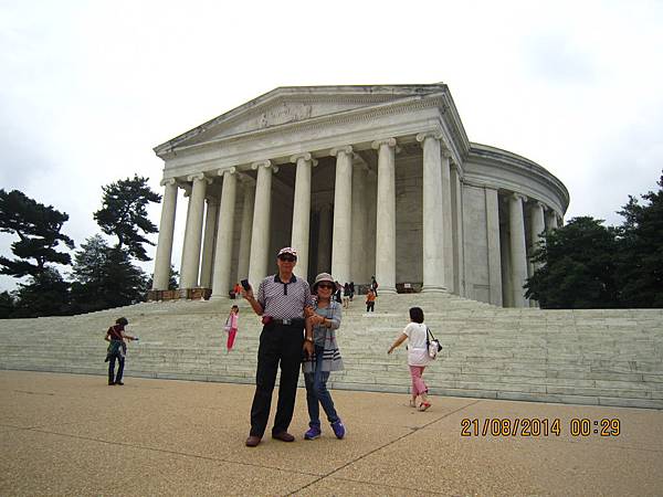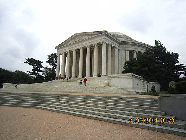 在華盛頓特區參觀的第一個景點是傑弗遜紀念堂。第三任美國總統湯瑪斯.傑弗遜(1801年-1809年)、同時也是《美國獨立宣言》的主要起草人、及美國開國元勳中最具影響力者之一。這座新古典主義建築是由約翰.羅素.波(John Russell Pope)設計、始建於1939年、於1943年完成。紀念堂位於華盛頓特區的潮汐湖邊、與華盛頓紀念碑遙遙相望。