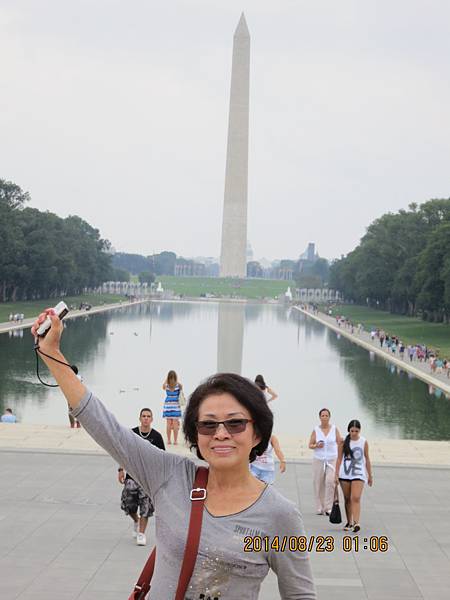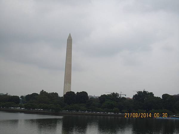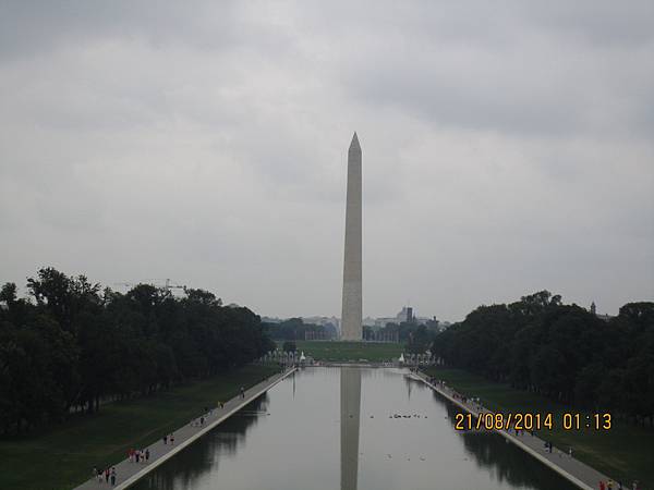 從林肯紀念堂石階上遙望過去、可以看到華盛頓紀念碑(Washington Monument)、這是華盛頓著名的地標之一。白色的埃及式方尖碑、四周環繞著美國國旗、建築設計簡單莊重。紀念碑高度169公尺、全用白色大理石砌成、乘電梯登上頂端可把整個華盛頓風光盡收眼底。