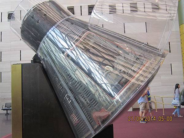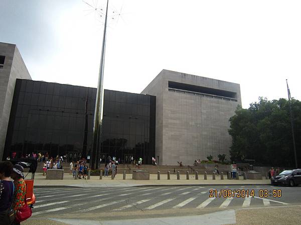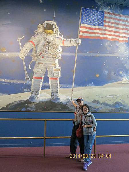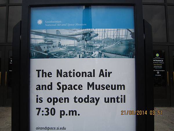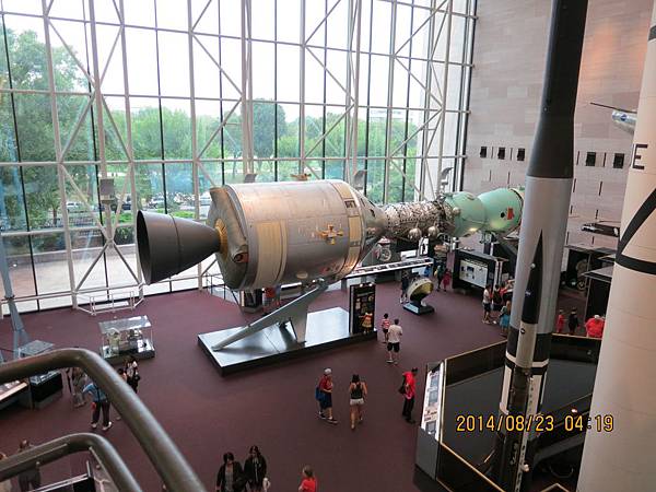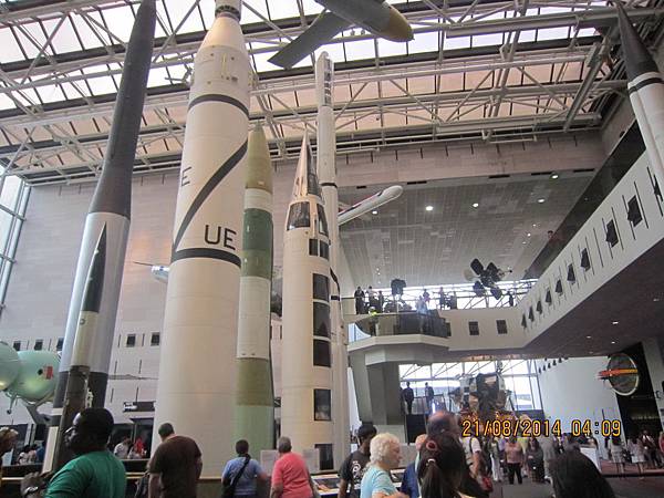 在華盛頓眾多博物館中、我們只安排參觀美國宇宙航空博物館(National Air and Space Museum)。它是目前世界上最大的飛行博物館、是以玻璃、大理石和鋼材構成的現代化建築。博物館的20多個大小展廳裡有大量的實物和圖片、陳列飛行史上具有重要意義的各類飛機、火箭、導彈、太空船、及著名太空人包括阿波羅11號太空船及太空人所使用過的器物如沐浴包等等。展品琳瑯滿目、還有1903年萊特兄弟發明第一架飛機以來、世界各國、包括美國在內的一百年來的航空歷史上每一步的發展歷程、詳盡、直接的展現在觀眾面前、非常具有參觀價值、我們的行程匆忙、一小時的參觀時間讓我和外子趕得氣喘吁吁、每一個展示廳都只能看重點、連跑三層樓、有些地方如太空艙還要排隊才能進入參觀。