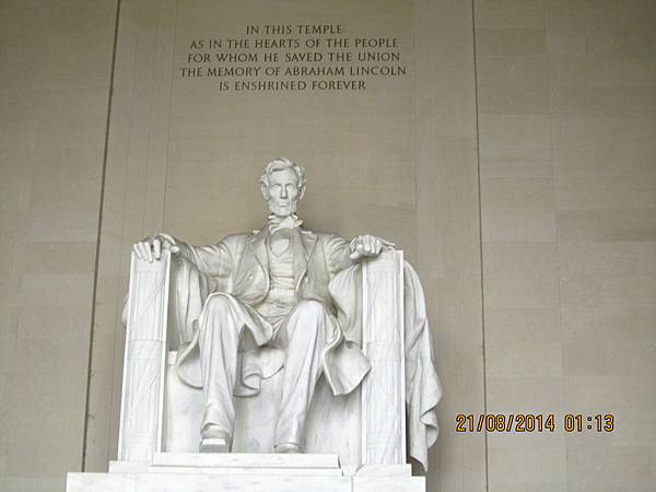 IN THIS TEMPLE, AS IN THE HEART OF THE PEOPLE,FOR WHOM HE SAVED THE UNION.THE MEMORY OF ABRAHAM LINCOLN IS ENSHRINED FOREVER「林肯將永垂不朽、永存人民心裡」。