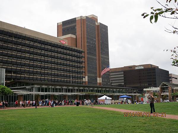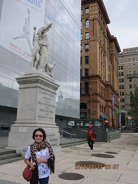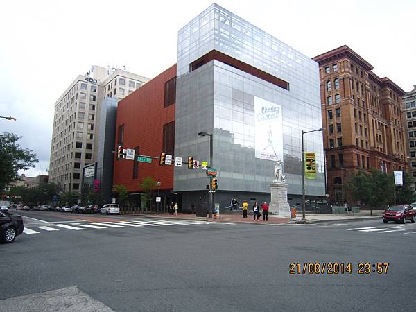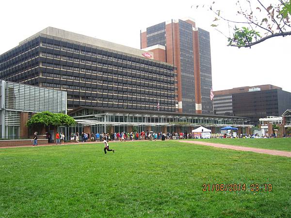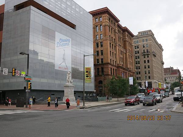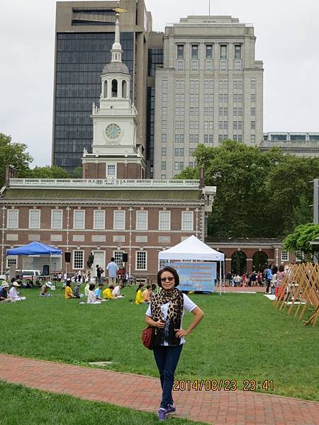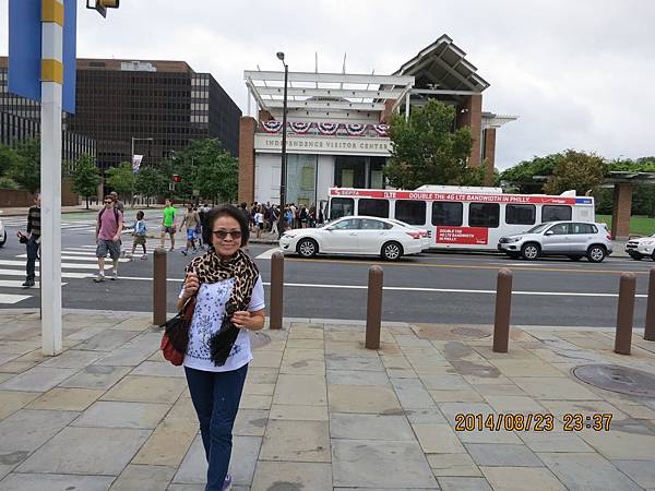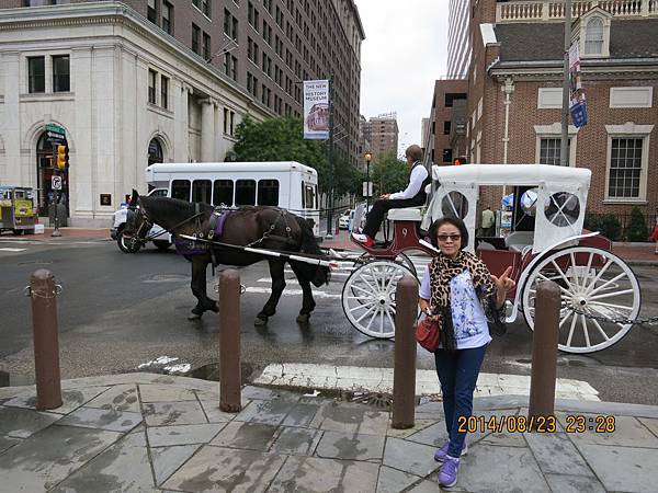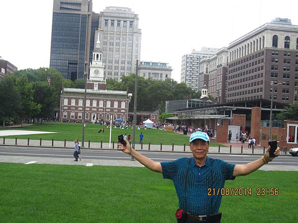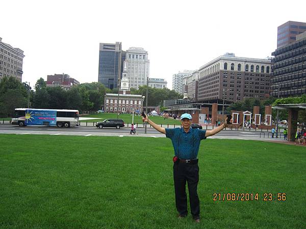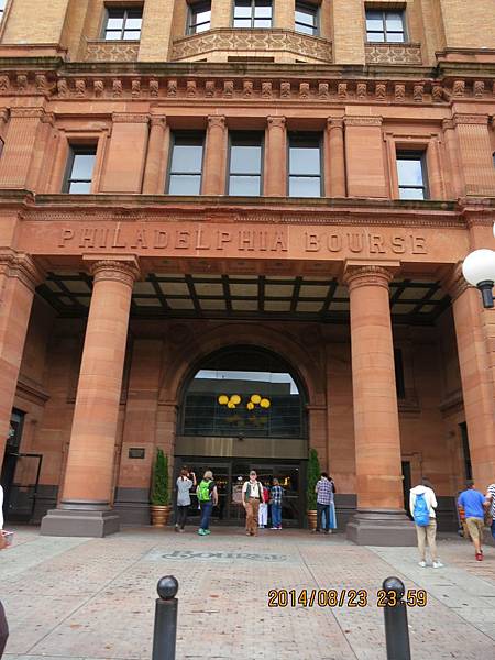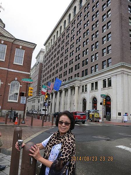 領隊讓我們自行參觀附近的建築物、沿著廣場旁的大街走、這一區大部份都是高樓林立的商業區、街道佈局呈棋盤狀、有銀行、證卷交易所、鑄幣廠等等。德拉瓦河是費城的重要河流、費城也是世界最大的河口港之一、沿河風光明媚、氣候涼爽、基本上、城市有安靜舒適感、是個適合安居樂業的城市、故費城也有〝住家城〞之稱、它還是富蘭克林的故鄉呢!