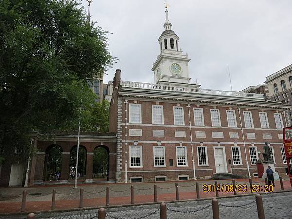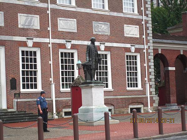 抵達費城後參觀的首站便是最有歷史價值的獨立廳。那是一座兩層舊式紅磚的樓房、乳白色的門窗及尖塔、塔中間鑲嵌著一座大時鐘。就是在這座獨立廳裡、誕生了《獨立宣言》和憲法。這裡還曾經是美國獨立戰爭的指揮中心、現在已成為美國歷史文物建築。樓房的正前方有一座華盛頓的黑色雕像。