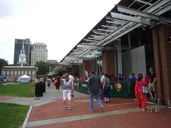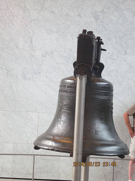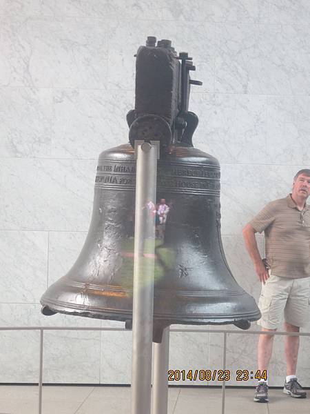 獨立廳前方是獨立廣場、自由鐘便是存放在廣場旁的紀念廳內、遊客排隊進入參觀、我們沒時間排隊、但可從一旁透過玻璃窗觀看。自由鐘是在倫敦製造、1752年被運到費城作為費城建州50週年紀念、但自由鐘被送到費城沒多久就被敲破裂、之後重新鑄造後再繼續使用。存放在費城的自由鐘是一座世界著名的鐘、雖然有裂痕、但它是自由正義的代表和美國獨立的標誌。自250多年前在費城獨立廳敲響第一聲後、成為廢除殖民地及獲得自由的象徵、每年吸引無數遊客前來参觀。