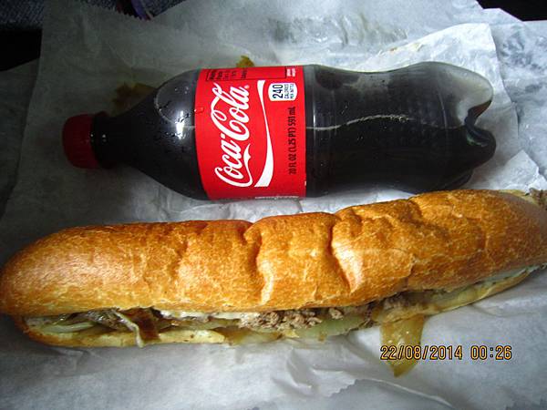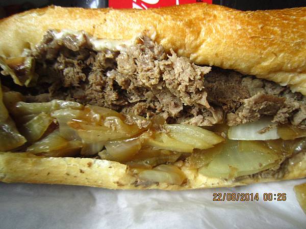 中午12點整離開費城前往位於紐約近郊的Woodbury Outlets。為了能騰出更多時間給大家購物、午餐改在車上吃費城非常有名的SOS牛肉堡。現做的牛肉堡好大一個、要價20元美金、到手時還是熱騰騰的、牛肉和洋葱味道香氣四溢、味道還不錯、只是對司機不好意思、他忙著替我們趕路、而我們卻在大快朵頤!