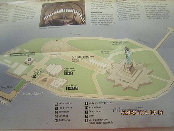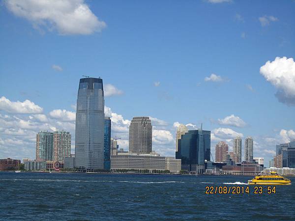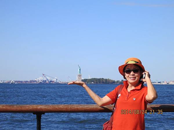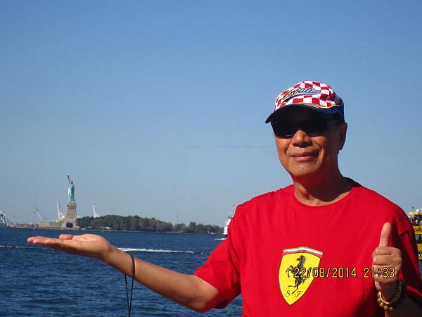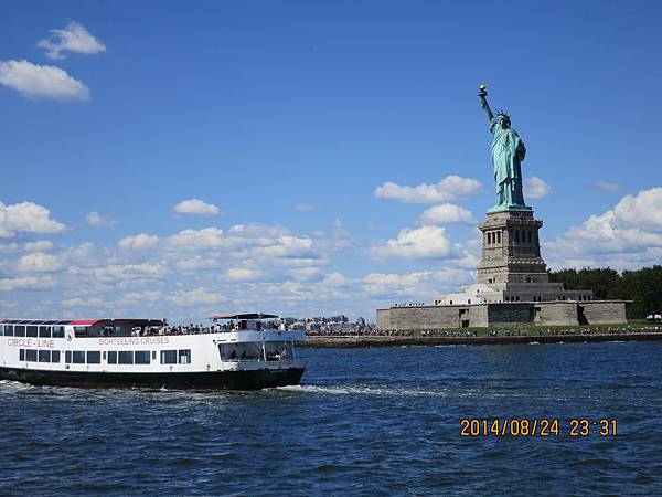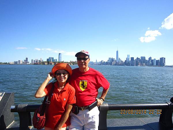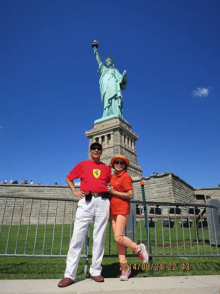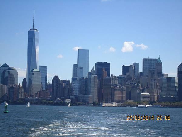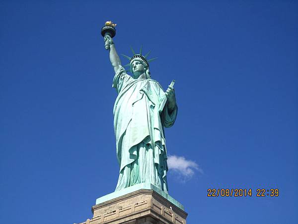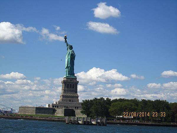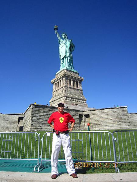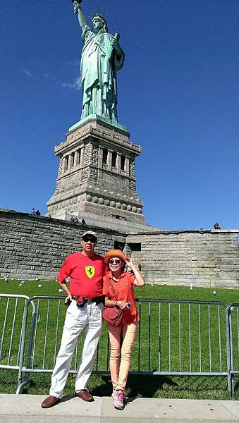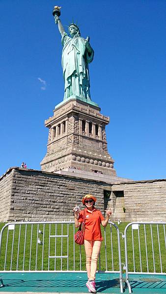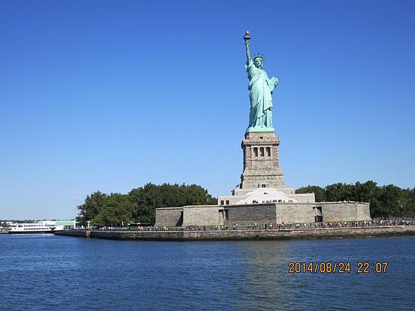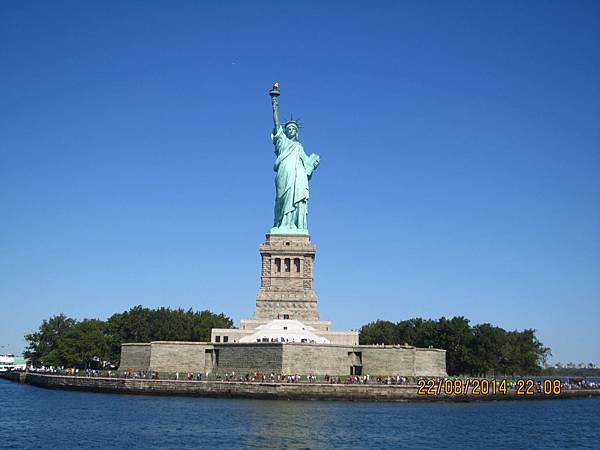 渡輪靠岸了、小小的自由島上除了一座自由女神像、密密麻麻的遊客外、旁邊還有一個小廣場、有草地和樹林、紀念品店和咖啡吧。島上臨海處有鐵欄杆、扶欄遠眺、只見曼哈頓金融中心的摩天大樓直竄雲霄、氣派耀眼的現代式建築在遠處閃耀光彩、呈現富強國家的泱泱氣度。繞島漫步、海風輕吹、令人心曠神怡、從其正面更近距離欣賞女神雕像、心中滿是興奮與感動。