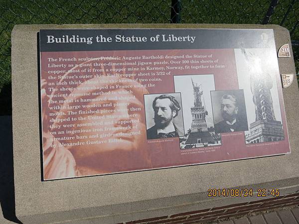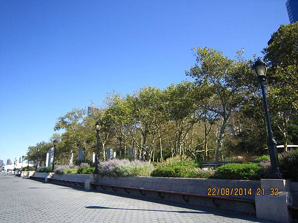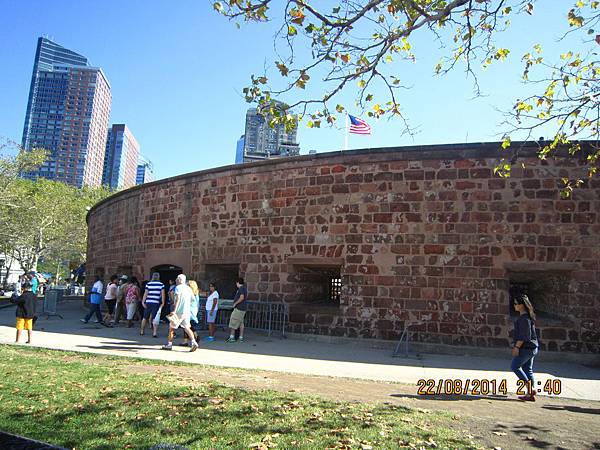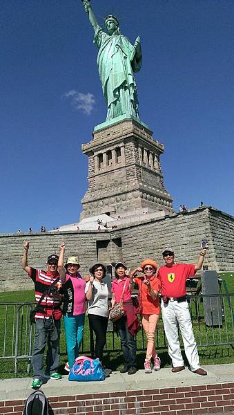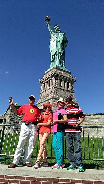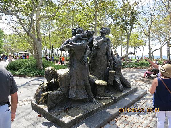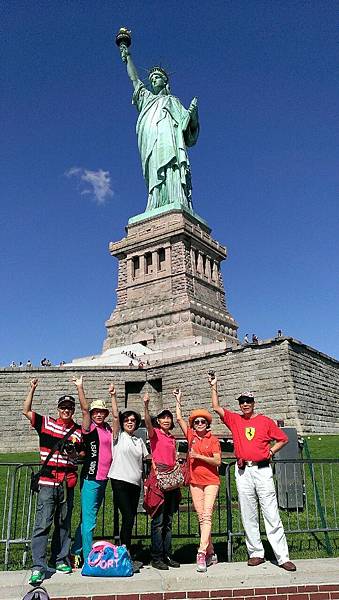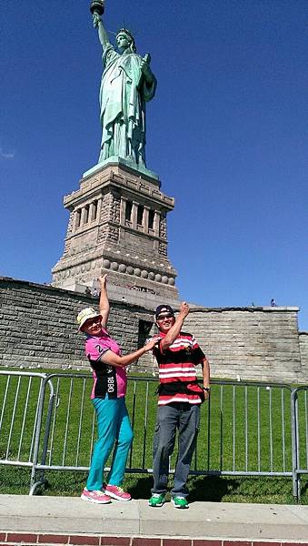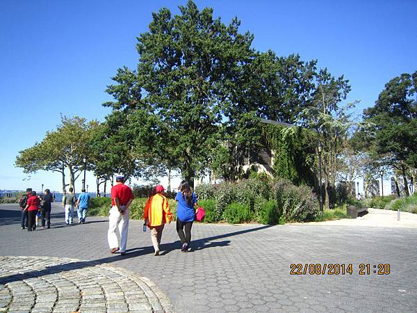 在紐約安排的第一個參觀景點是座落在自由島(Liberty Island)上舉世聞名的自由女神(Statue of Liberty)像。來紐約、不論是美國人還是外國人、都會去參觀自由女神像。遊客從炮台公園處購票搭船即可登島遊覽一番。炮台公園位於曼哈頓島南端、由於公園內有一座英國殖民時代遺留下來的古老炮台因而得名。在18世紀的移民時代、這裡曾是移民檢查哨、如今是前往自由島的碼頭所在地。此外公園內還有多座雕塑和紀念碑、以紀念移民時代因遠渡重洋而失去性命的許多人。公園北端面向曼哈頓金融中心的高樓大廈、南端則面向碧海藍天、海堤邊可遠眺3公里外的自由島及自由女神像。