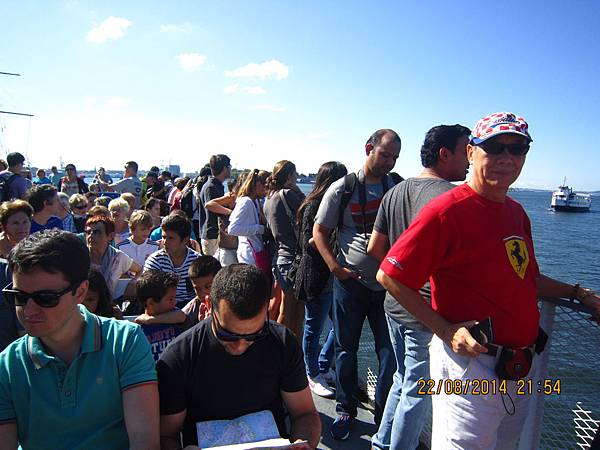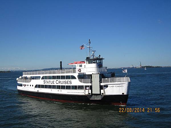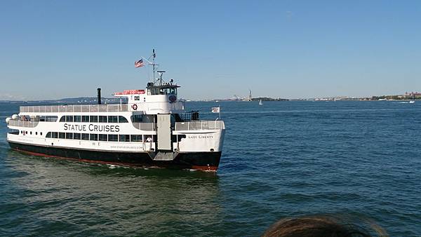 渡輪的往來班次相當密集、平均每15分鐘一班、每位遊客上船前都必需經過安檢才可以登上Statue Cruises渡輪。我們坐上10:00點開的船、為了能將美景看得更清楚、特地登上渡輪的最上層、靠在欄杆上欣賞漸行漸近的自由島。