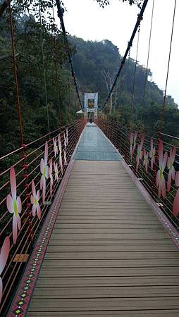 琉璃光之橋不長、大約只有90公尺、橋纜塗上亮眼彩漆、橋圍欄上點綴在地農特產葡萄及油桐花圖騰、鮮麗奪目、因此也有〝彩虹吊橋〞之稱。