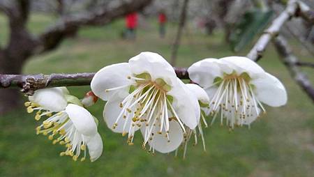 梅園的老梅樹少說已有4、50年歷史、蒼勁樹形開散、姿態優美。老樹遮蔭、起伏錯落有致的丘陵青草地綠草如茵、造就如畫美景、暗香浮動、唯美夢幻。雅致的情境總能吸引不少人在梅樹下散步或品茗、徜徉在藍天白雲陽光下、顯得清幽俊雅、浪漫悠閒、冬日小確幸就隨人各自發揮了。