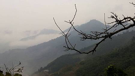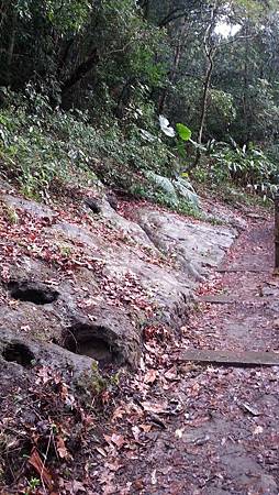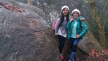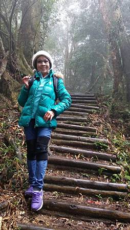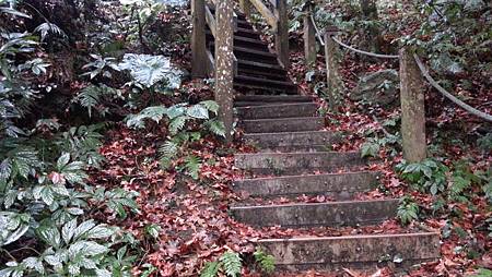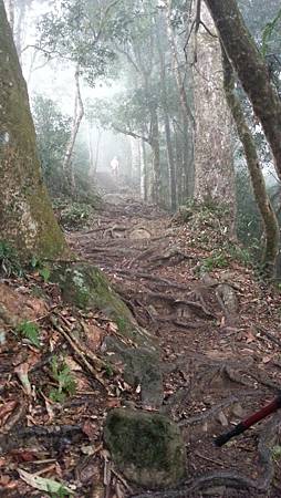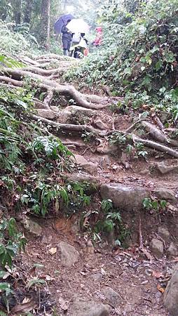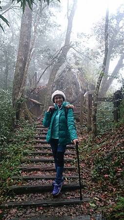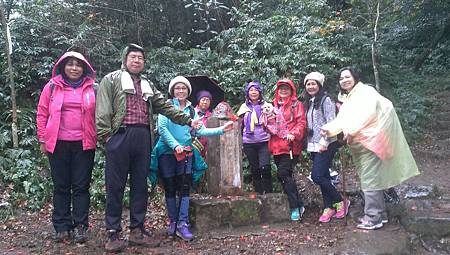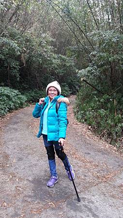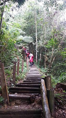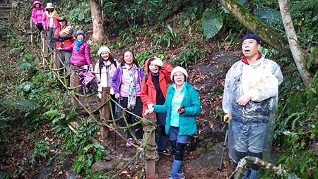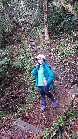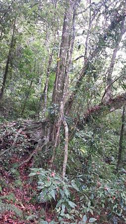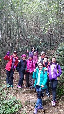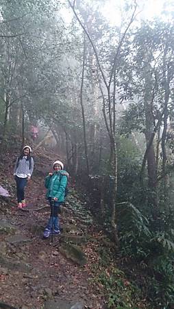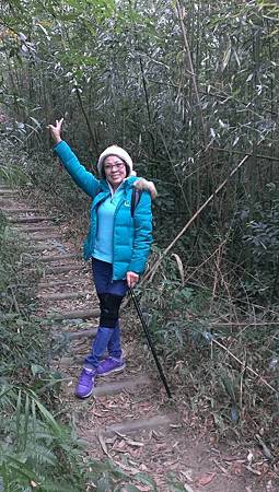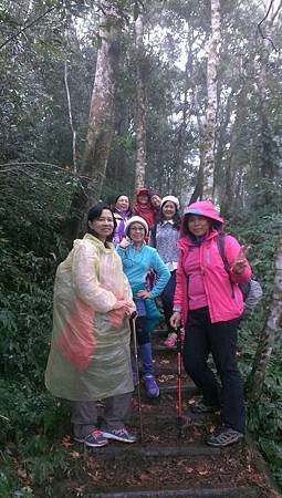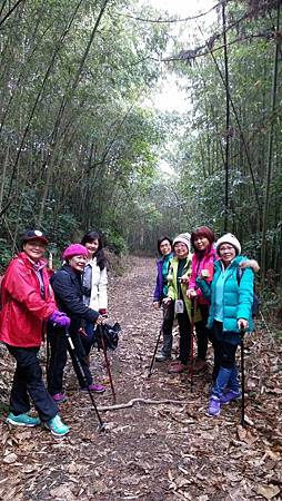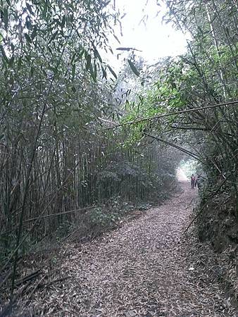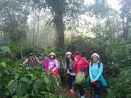 從登山口出發、踏著質樸的泥土路、穿梭於整大片的桂竹林中、盤繞而上、山坡漸陡、原始森林叢生、林相完整濃密、而且天然景觀奇特、屬中海拔暖溫帶闊葉林區。行進當中開始下起小雨、濕又滑的山徑走起來格外吃力、儘管如此、愛拍照的依舊在小雨中擺出美姿和甜美的笑容。