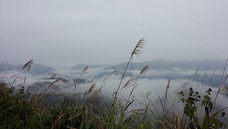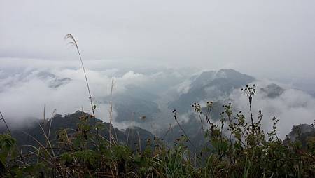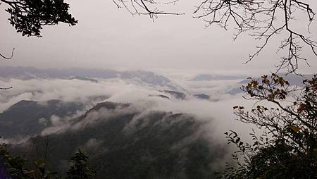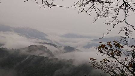 山頂觀景平台大約有半個籃球場大、那兒有一座馬那邦山一等三角點、這裡海拔1406公尺。天氣晴朗時、從山頂眺望、視野一覽無遺、不但可遠眺大安溪流域和雪霸國家公園、大霸尖山、還可以將大雪山聖稜線層巒疊翠盡收眼底。今天天候雖不佳、但可觀賞到翻騰的雲海和雲瀑、雪白綿密的雲海、浮浮沉沉、一直延續到天邊。群山在雲海中若隱若現、雲瀑一瀉千里的美景、宛如一幅幅動人的山水畫作、非常狀觀。咱們在山頂賞景、那兒有棵小楓樹是拍照的焦點、趙領隊在下方的平台煮咖啡、另有一隊山友搭了雨棚在野炊、都是一群愛山又喜歡大自然的朋友、能在馬那邦山頂上邂逅、不也是緣嗎!