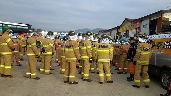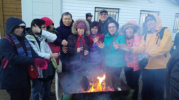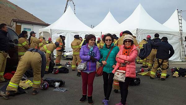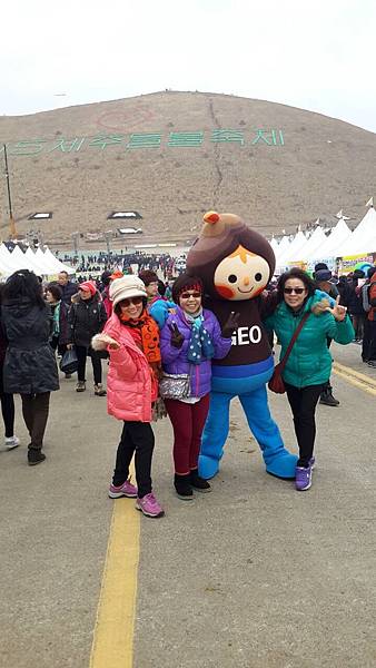 逛累了,離7:30分還有2小時,只好在舞台前找位子坐下觀賞節目打發時間。活動的重點是點燃野火,大家都以為要燒的只是山坡上的幾座茅草堆和一綑一綑的稻草堆,沒想到燒的是面前的整座山嶽,真是被嚇到了!但是天氣越來越冷,只好找地方烤火,最後大夥兒索性圍個圈圈跳起山地舞來,動起來後才覺得暖和一些,最後找到一座帳篷內免費提供熱咖啡。其實園區內還備有暖爐的帳篷,只是園區太大了,幾百座白帳篷,也不知座落何處,導遊不在,語言不通,韓國人好像都不會講英文,有雞同鴨講聽嘸的挫折感。
