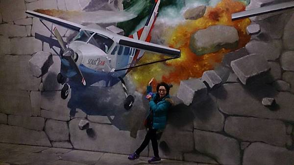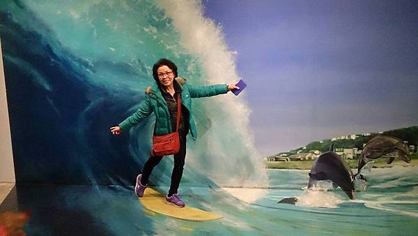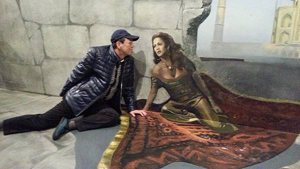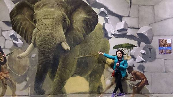 逃也似地離開冰雕館後,來到二樓的3D奇幻藝術館。館內的牆壁上或是地板上都有深具創意、變化多樣的3D畫作。參觀者藉由視覺上的遠近感、視差、燈光折射的明暗度以及3D立體圖案,讓人產生錯覺,彷彿身入其境而對藝術產生共鳴,也讓人拍出彷彿身處其境的逼真照片,實在很有趣。館內的每一件作品都讓人看得咋咋稱奇,每一件也都讓我們玩得不亦樂乎。這裡有齊聚歐洲各國50多位世界名畫家的3D畫作,從希臘神話背景故事、叢林動物到生活趣味主題,點跟面也能創造出3D立體真實感,的確不簡單。