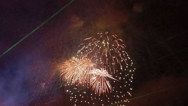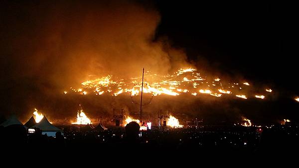 看著眼前長長的火龍,圍觀的人們開始搔動起來,舞台主持人語氣激動高昂,說些啥完全聽不懂,我只在想;那麼大範圍的半座山嶽到底要從哪裡先開始點燃,突然間!山頂上開始劈里啪啦地燃放五顏六色烟火!雷射燈光直竄雲宵,把整個天空照亮了,沒多久,一柱特殊的煙火升空後化成數百點火苗散落在山嶽上的乾草上,嘩!點燃了!原來是如此這般點火方式,又長知識了!因為隔了好遠,天色又暗,人又多又冷,只有手機拍照片,不但難拍,效果又不理想,索性就懶得拍了。