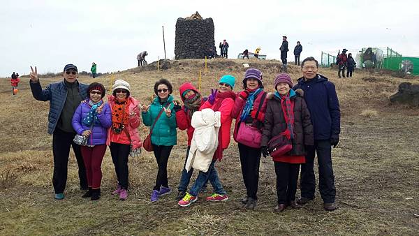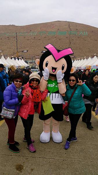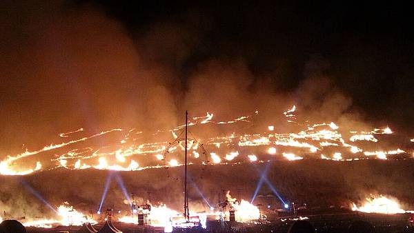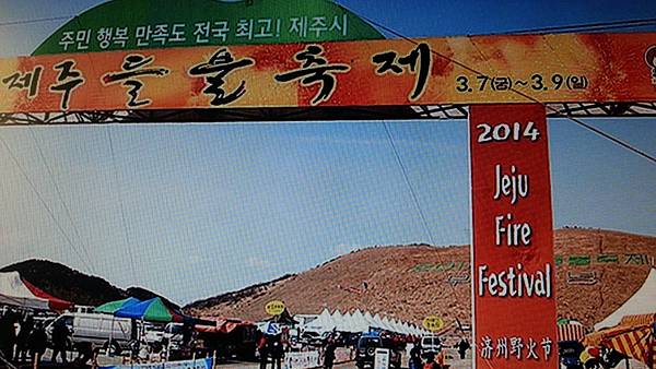 火燒後面這整座山嶽,半山上寫著韓文,大慨是『2015濟州島野火節慶典』的意思吧!