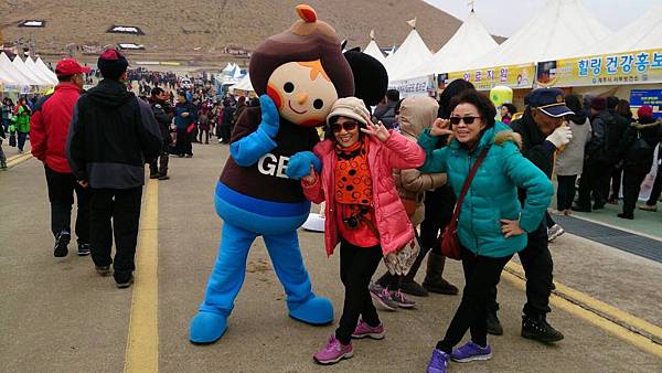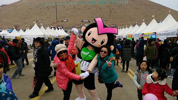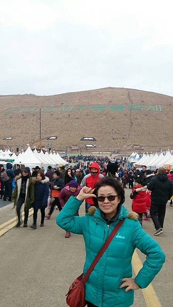 慶典場地位於市郊『新星岳』的一片空曠原野上。整個範圍佔地約30萬平方公尺,車多人更多,遠遠地便看到會場熱鬧的像是舉辦園遊會一般,一座一座白色帳篷展售攤位多到數不清,有賣吃的、喝的、用的、手工藝品、化妝品等等,以賣吃的最多。由於人群實在擁擠,導遊小孫叮嚀我們儘量走在一起,今天的晚餐是每人發放韓幣8千元 折合台幣不到300元 (NT$1=30韓幣),自行在園區解决。