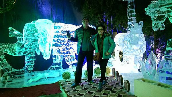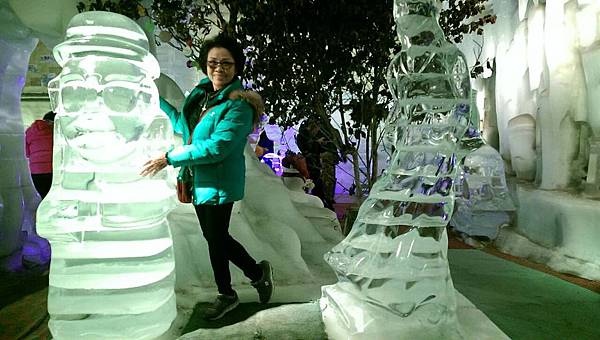 下午2:00點從博物館來到濟州島第一個四季常設的室內冰雕展示館和3D奇幻藝術館。冰雕館成立於2012年7月,規模並不算大,館內不論季節,全年溫度保持在零下5度C。剛踏進館內,只覺得一陣寒氣逼人,但晶瑩剔透的各式冰雕瞬間分散了我們的注意力,大夥兒紛紛在雪梯上滑雪,再仔細欣賞每一件精彩的作品。