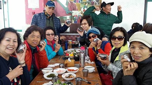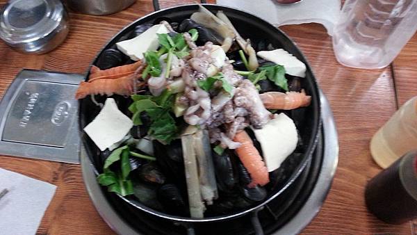 韓服穿穿脫脫,照片也東拍西拍,大夥兒玩得興高彩烈,時間也在不知不覺中溜走。午餐時間到了,吃個較清淡些的海鮮火鍋吧!天氣冷颼颼的,吃火鍋暖暖身體是最幸福的。看到一整鍋的貝類、小龍蝦、章魚、蝦子,在滾燙的淘鍋中,各式海鮮的精華都融入鍋裡,讓人忍不住大呼過癮。