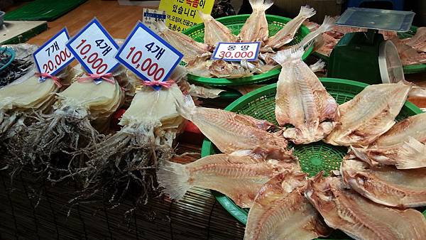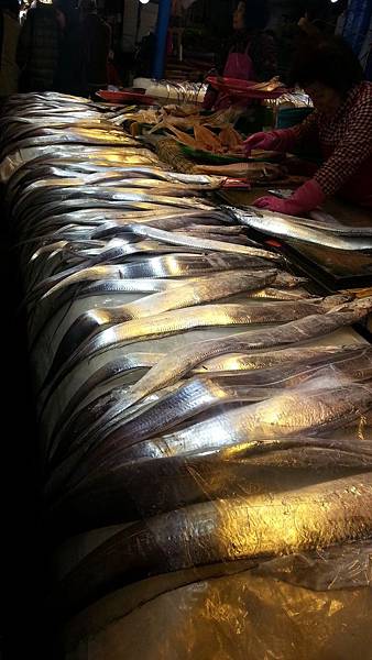 在東門市場東繞繞,西逛逛,看到最多的要數白帶魚了,原來濟州島海域盛產肉質鮮美的白帶魚,這裡的白帶魚特別有光澤,銀光閃閃,肉質肥厚,煎成酥香金黃色一定非常可口。市場裡除了白帶魚多,醃成一夜干的馬頭魚也很多,據說島上的人愛吃烤馬頭魚,在半乾的魚身上塗上一層麻油,烤成外酥內軟,魚肉的鮮美多汁全部鎖在酥脆的外皮內,趁熱吃可配好幾碗飯餒!想著.. 想著,肚子竟然餓起來了!