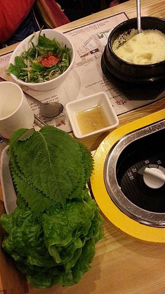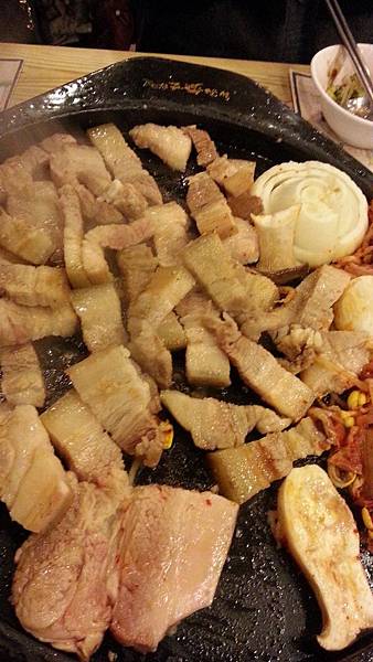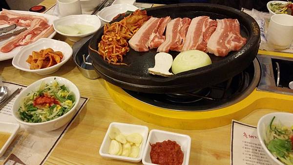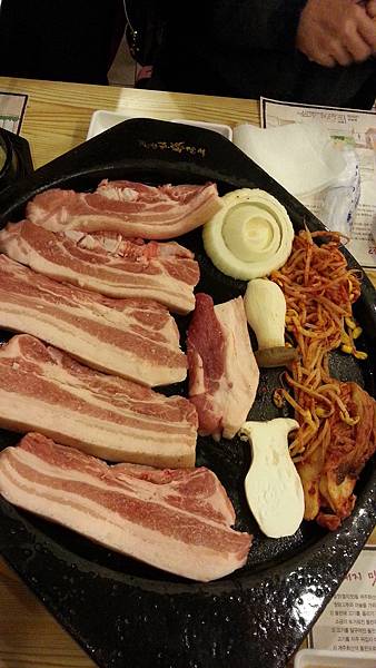 今天晚餐提早於4:30分,因為5:00要看「亂打秀」。 晚餐還是吃豬肉,但level更上一層,今晚吃的是米其林推薦Dombe豚濟州黑毛豬烤肉餐。超愛吃豬肉的韓國人心目中除了排名第一的韓牛,就是濟州島的烤黑毛豬。明天要回國了,今晚的farewell dinner當然要吃高檔一點~嚐嚐令韓國人齒頰留香的烤黑毛豬肉大餐。看到那幾片豬肉時,還真有點被嚇到;好大又好厚一片啊!就這麽地在鐵板上烤到吱吱作響,油香滿室,把肉煎烤至兩面呈金黄色,剪成小塊,用新鮮的生菜或紫蘇葉包起一片豬肉加上泡菜和大蒜,沾上一些韓式醬料,一口送入嘴,大家邊咀嚼邊點頭,眉眼中全寫著幸福和滿足!