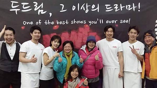 晚餐後是觀賞韓國著名的「亂打秀」,這也是來韓國旅行必安排的節目。亂打秀(Nanta) 從1997年開始風行,以前在首爾也看過,節目內容講述發生在一個餐廳廚房裡的故事,表演者把廚房用具、菜刀和蔬菜當素材,邊做菜邊表演,全場秀沒有一句對白,全靠打擊樂和演員的肢體語言呈現劇情,而充滿熱情與活力的節奏聲更是響徹整個會場。一個半小時的表演毫無冷場,讓台下觀眾都融入表演中,大人小孩笑呵呵!鼓掌聲與叫好聲久久不散。